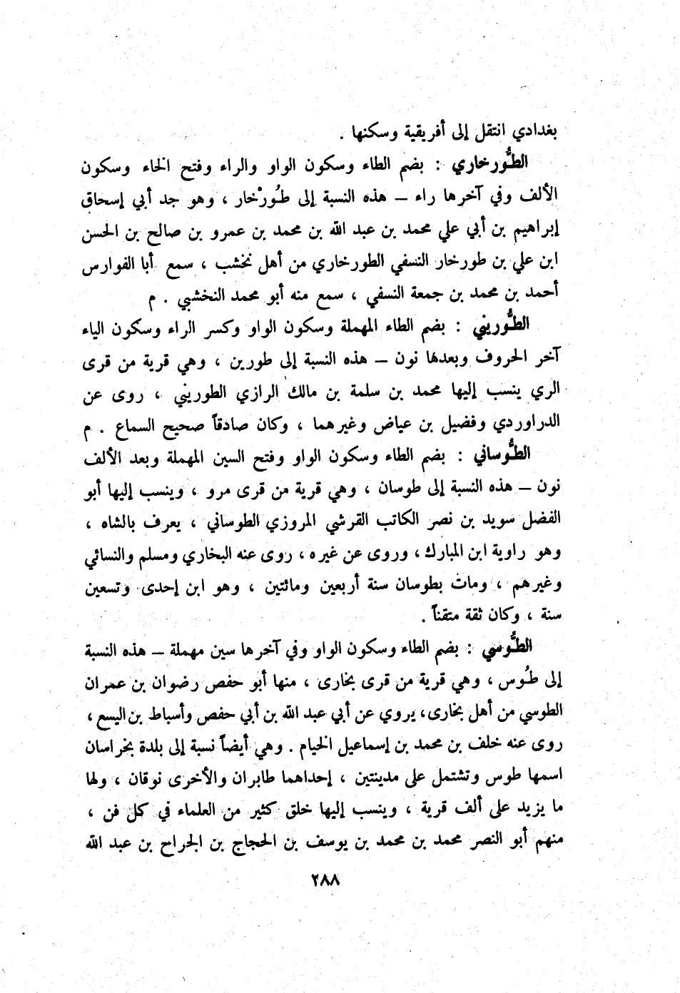الطوسي بِضَم الطَّاء وَسُكُون الْوَاو وَفِي آخرهَا سين مُهْملَة - هَذِه النِّسْبَة إِلَى طوس وَهِي قَرْيَة من قرى بُخَارى مِنْهَا أَبُو حَفْص رضوَان بن عمرَان الطوسي من أهل بُخَارى يروي عَن أبي عبد الله بن أبي حَفْص وأسباط بن اليسع روى عَنهُ خلف بن مُحَمَّد بن إِسْمَاعِيل الْخيام وَهِي أَيْضا نِسْبَة إِلَى بَلْدَة بخراسان اسْمهَا طوس وتشتمل على مدينتين إِحْدَاهمَا طابران وَالْأُخْرَى نوقان وَلها مَا يزِيد على ألف قَرْيَة وينسب إِلَيْهَا خلق كثير من الْعلمَاء فِي كل فن مِنْهُم أَبُو النَّصْر مُحَمَّد بن مُحَمَّد بن يُوسُف بن الْحجَّاج بن الْجراح بن عبد الله