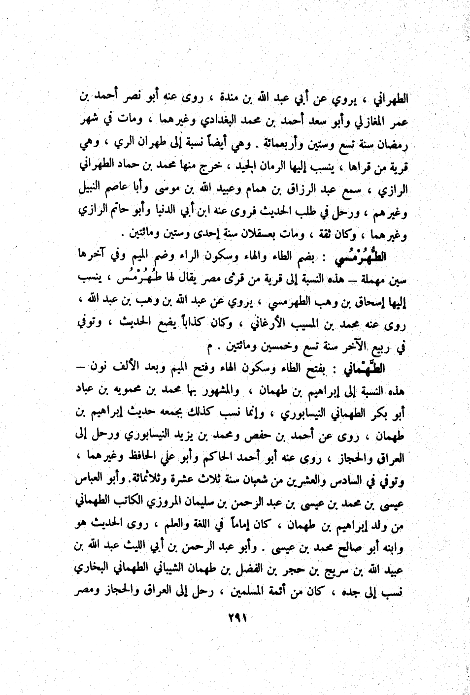 الطهراني يروي عَن أبي عبد الله بن مندة روى عَنهُ أَبُو نصر أَحْمد بن عمر المغازلي وابو سعد أَحْمد بن مُحَمَّد الْبَغْدَادِيّ وَغَيرهمَا وَمَات فِي شهر رَمَضَان سنة تسع وَسِتِّينَ وَأَرْبَعمِائَة وَهِي أَيْضا نِسْبَة إِلَى طهران الرّيّ وَهِي قَرْيَة من قراها ينْسب إِلَيْهَا الرُّمَّان الْجيد خرج مِنْهَا مُحَمَّد بن حَمَّاد الطهراني الرَّازِيّ سمع عبد الرَّزَّاق بن همام وَعبيد الله بن مُوسَى وَأَبا عَاصِم النَّبِيل وَغَيرهم ورحل فِي طلب الحَدِيث فروى عَنهُ ابْن أبي الدُّنْيَا وَأَبُو حَاتِم الرَّازِيّ وَغَيرهمَا وَكَانَ ثِقَة وَمَات بعسقلان سنة إِحْدَى وَسِتِّينَ وَمِائَتَيْنِ