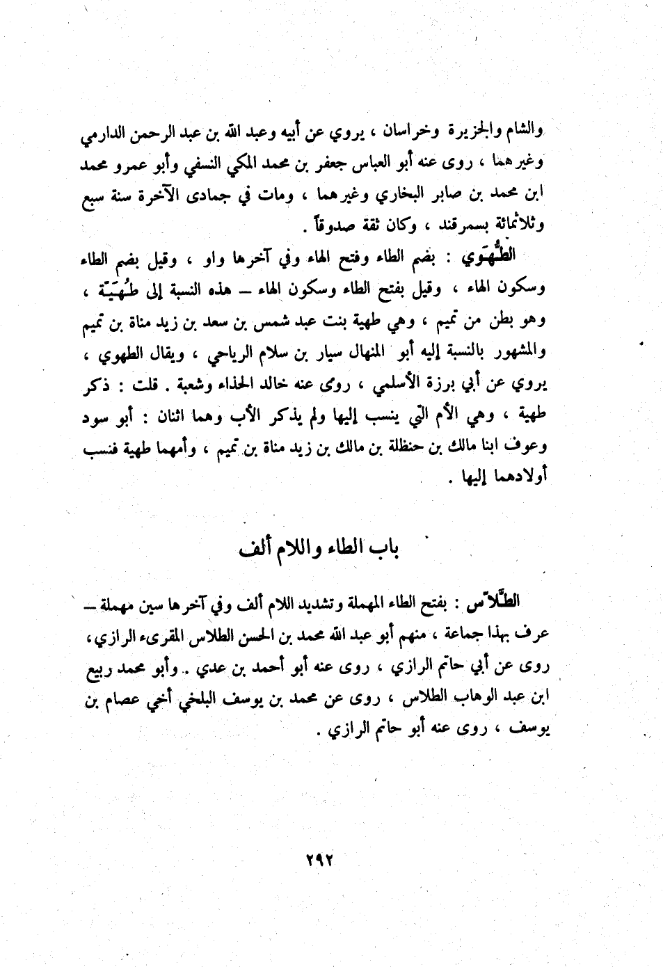 الطلاس بِفَتْح الطَّاء الْمُهْملَة وَتَشْديد اللَّام ألف وَفِي آخرهَا سين مُهْملَة - عرف بِهَذَا جمَاعَة مِنْهُم أَبُو عبد الله مُحَمَّد بن الْحسن الطلاس الْمُقْرِئ الرَّازِيّ روى عَن أبي حَاتِم الرَّازِيّ روى عَنهُ ابو أَحْمد بن عدي وَأَبُو مُحَمَّد ربيع ابْن عبد الْوَهَّاب الطلاس روى عَن مُحَمَّد بن يُوسُف الْبَلْخِي أخي عِصَام بن يُوسُف روى عَنهُ أَبُو حَاتِم الرَّازِيّ