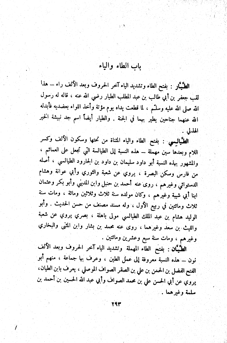 الطَّيَالِسِيّ بِفَتْح الطَّاء وَالْيَاء الْمُثَنَّاة من تحتهَا وَسُكُون الْألف وَكسر اللَّام وَبعدهَا سين مُهْملَة - هَذِه النِّسْبَة إِلَى الطيالسة الَّتِي تجْعَل على العمائم وَالْمَشْهُور بِهَذِهِ النِّسْبَة أَبُو دَاوُد سُلَيْمَان بن دَاوُد بن الْجَارُود الطَّيَالِسِيّ أَصله من فَارس وَسكن الْبَصْرَة يروي عَن شُعْبَة وَالثَّوْري وَأَبُو عوَانَة وَهِشَام الدستوَائي وَغَيرهم روى عَنهُ أَحْمد بن حَنْبَل وَابْن الْمَدِينِيّ وَأَبُو بكر وَعُثْمَان ابْنا أبي شيبَة وَغَيرهم وَكَانَ مولده سنة ثَلَاث وَثَلَاثِينَ وَمِائَة وَمَات سنة ثَلَاث وَمِائَتَيْنِ فِي ربيع الأول وَله مُسْند مُصَنف من حسن الحَدِيث وَأَبُو الْوَلِيد هِشَام بن عبد الْملك الطَّيَالِسِيّ مولى باهلة بَصرِي يروي عَن شُعْبَة وَاللَّيْث بن سعد وَغَيرهمَا روى عَنهُ مُحَمَّد بن بشار وَابْن الْمثنى وَالْبُخَارِيّ وَغَيرهم وَمَات سنة سبع وَعشْرين وَمِائَتَيْنِ