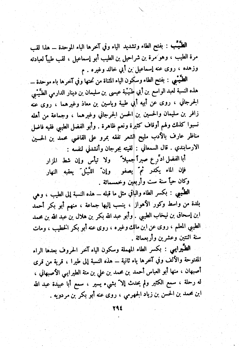 الطَّيِّبِيّ بِفَتْح الطَّاء وَسُكُون الْيَاء الْمُثَنَّاة من تحتهَا وَفِي آخرهَا بَاء مُوَحدَة - هَذِه النِّسْبَة لعبد الْوَاسِع بن أبي طيبَة عِيسَى بن سُلَيْمَان بن دِينَار الدَّارمِيّ الطَّيِّبِيّ الْجِرْجَانِيّ روى عَن أَبِيه أبي طيبَة وَيَاسِين بن معَاذ وَغَيرهمَا روى عَنهُ زَافِر بن سُلَيْمَان وَالْحُسَيْن بن الْحسن الْجِرْجَانِيّ وَغَيرهمَا وَجَمَاعَة من أَهله نسبوا كَذَلِك وَلَهُم أوقاف كَثِيرَة وَنعم ظَاهِرَة وَأَبُو الْفضل الطَّيِّبِيّ فَقِيه فَاضل مناظر عَارِف بالأدب مليح الشّعْر تفقه بمرو على القَاضِي مُحَمَّد بن الْحُسَيْن الارسابندي قَالَ السَّمْعَانِيّ لَقيته بجرجان وأنشدني لنَفسِهِ