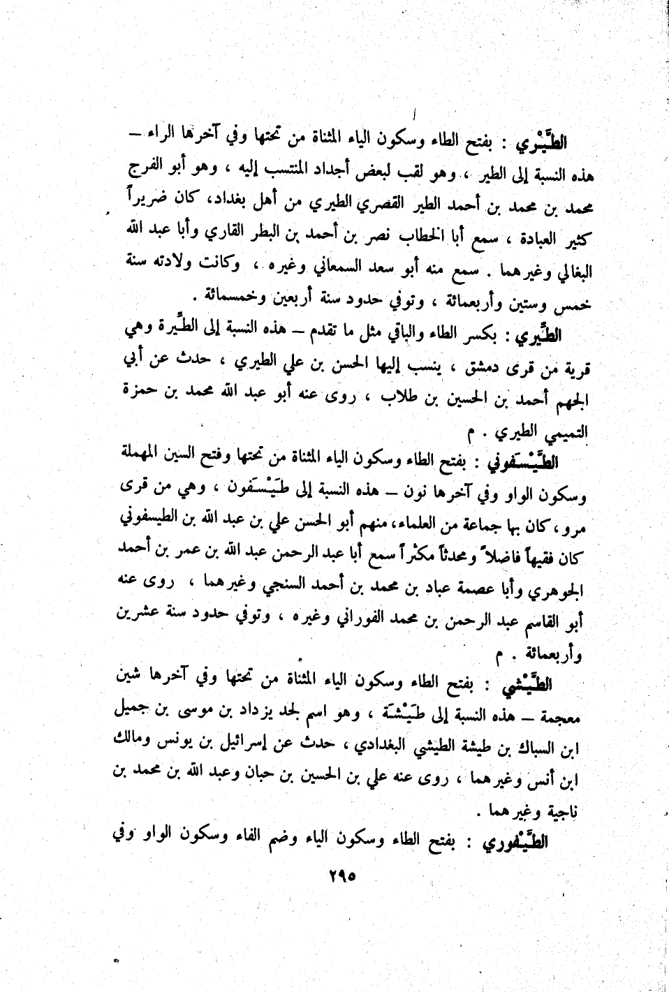 الطيري بِفَتْح الطَّاء وَسُكُون الْيَاء الْمُثَنَّاة من تحتهَا وَفِي آخرهَا الرَّاء - هَذِه النِّسْبَة إِلَى الطير وَهُوَ لقب لبَعض أجداد المنتسب إِلَيْهِ وَهُوَ أَبُو الْفرج مُحَمَّد بن مُحَمَّد بن أَحْمد الطير القصري الطيري من أهل بَغْدَاد كَانَ ضريرا كثير الْعِبَادَة سمع أَبَا الْخطاب نصر بن أَحْمد بن البطر الْقَارِي وَأَبا عبد الله البغالي وَغَيرهمَا سمع مِنْهُ أَبُو سعد السَّمْعَانِيّ وَغَيره وَكَانَت وِلَادَته سنة خمس وَسِتِّينَ وَأَرْبَعمِائَة وَتُوفِّي حُدُود سنة أَرْبَعِينَ وَخَمْسمِائة