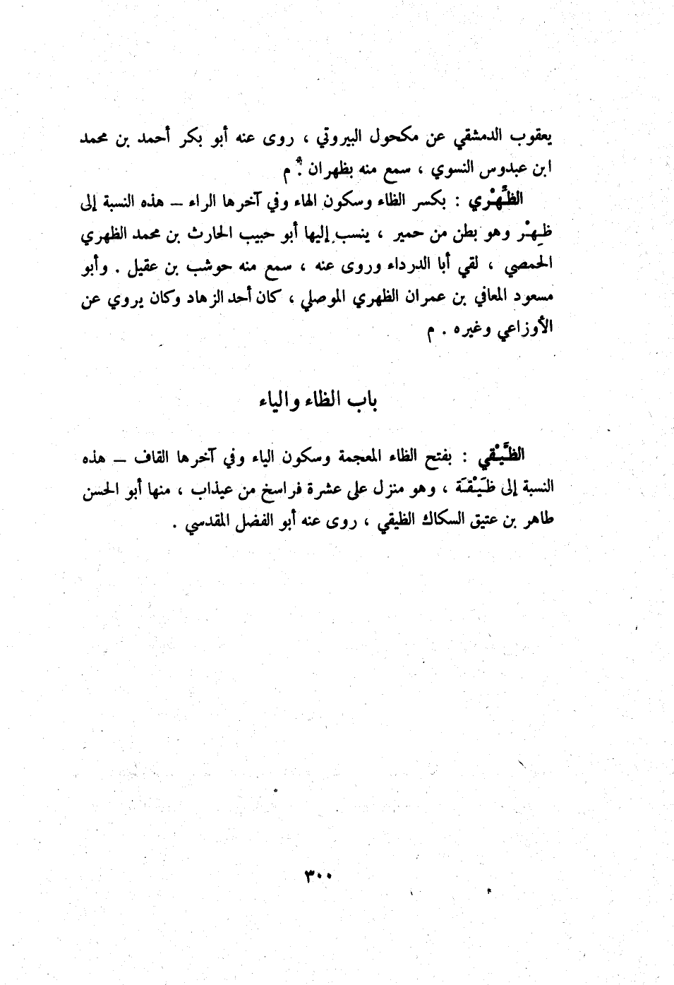 الظهري بِكَسْر الظَّاء وَسُكُون الْهَاء وَفِي آخرهَا الرَّاء - هَذِه النِّسْبَة إِلَى ظهر وَهُوَ بطن من حمير ينْسب إِلَيْهَا أَبُو حبيب الْحَارِث بن مُحَمَّد الظهري الْحِمصِي لَقِي أَبَا الدَّرْدَاء وروى عَنهُ سمع مِنْهُ حَوْشَب بن عقيل وَأَبُو مَسْعُود الْمعَافي بن عمرَان الظهري الْموصِلِي كَانَ أحد الزهاد وَكَانَ يروي عَن الْأَوْزَاعِيّ وَغَيره م
