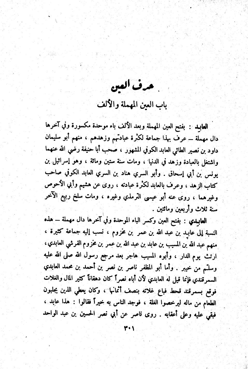 العابد بِفَتْح الْعين الْمُهْملَة وَبعد الْألف بَاء مُوَحدَة مَكْسُورَة وَفِي آخرهَا دَال مُهْملَة - عرف بِهَذَا جمَاعَة لِكَثْرَة عِبَادَتهم وزهدهم مِنْهُم أَبُو سُلَيْمَان دَاوُد بن نصير الطَّائِي العابد الْكُوفِي الْمَشْهُور صحب أَبَا حنيفَة رَضِي الله عَنْهُمَا واشتغل بِالْعبَادَة وزهد فِي الدُّنْيَا وَمَات سنة سِتِّينَ وَمِائَة وَهُوَ إِسْرَائِيل بن يُونُس بن أبي إِسْحَاق وَأَبُو السّري هناد بن السّري العابد الْكُوفِي صَاحب كتاب الزّهْد وَعرف بالعابد لِكَثْرَة عِبَادَته روى عَن هشيم وَأبي الْأَحْوَص وَغَيرهمَا روى عَنهُ أَبُو عِيسَى التِّرْمِذِيّ وَغَيره وَمَات سلخ ربيع الآخر سنة ثَلَاث وَأَرْبَعين وَمِائَتَيْنِ