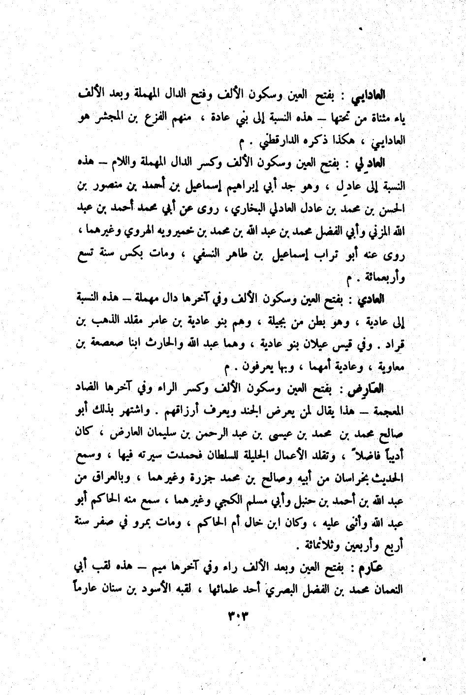 العادي بِفَتْح الْعين وَسُكُون الْألف وَفِي آخرهَا دَال مُهْملَة - هَذِه النِّسْبَة إِلَى عَادِية وَهُوَ بطن من بجيلة وهم بَنو عَادِية بن عَامر مقلد الذَّهَب بن قراد وَفِي قيس عيلان بَنو عَادِية وهما عبد الله والْحَارث ابْنا صعصعة بن مُعَاوِيَة وعادية أمهما وَبهَا يعْرفُونَ م