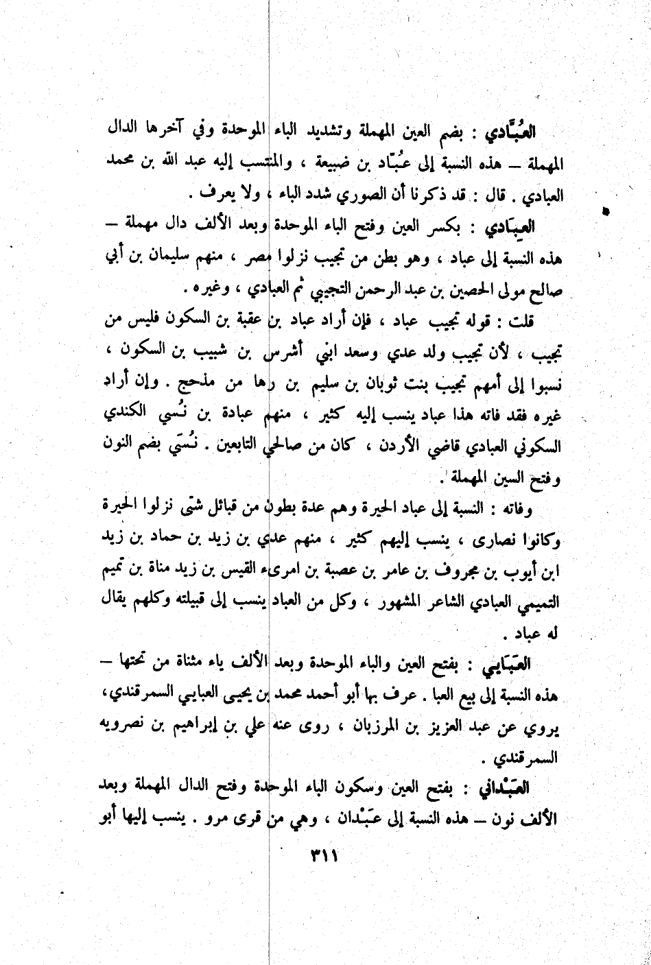 الْعَبَّادِيّ بِضَم الْعين الْمُهْملَة وَتَشْديد الْبَاء الْمُوَحدَة وَفِي آخرهَا الدَّال الْمُهْملَة - هَذِه النِّسْبَة إِلَى عباد بن ضبيعة والمنتسب إِلَيْهِ عبد الله بن مُحَمَّد الْعَبَّادِيّ قَالَ قد ذكرنَا أَن الصُّورِي شدد الْبَاء وَلَا يعرف