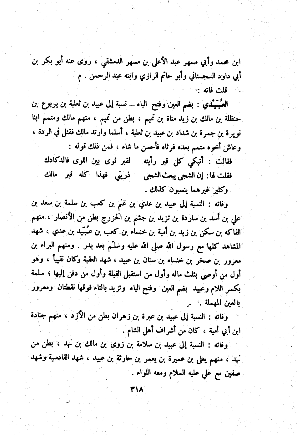 وَفَاته النِّسْبَة إِلَى عبيد بن عدي بن غنم بن كَعْب بن سَلمَة بن سعد بن عَليّ بن أَسد بن ساردة بن تزيد بن جشم بن الْخَزْرَج بطن من الْأَنْصَار مِنْهُم الْفَاكِه بن سكن بن زيد بن أُميَّة بن خنساء بن كَعْب بن عبيد بن عدي شهد الْمشَاهد كلهَا مَعَ رَسُول الله صلى الله عَلَيْهِ وَسلم بعد بدر وَمِنْهُم الْبَراء بن معْرور بن صَخْر بن خنساء بن سِنَان بن عبيد شهد الْعقبَة وَكَانَ نَقِيبًا وَهُوَ أول من أوصى بِثلث مَاله وَأول من اسْتقْبل الْقبْلَة وَأول من دفن إِلَيْهَا سَلمَة بِكَسْر اللَّام وَعبيد بِضَم الْعين وَفتح الْبَاء وتزيد بِالتَّاءِ فَوْقهَا نقطتان ومعرور بِالْعينِ الْمُهْملَة