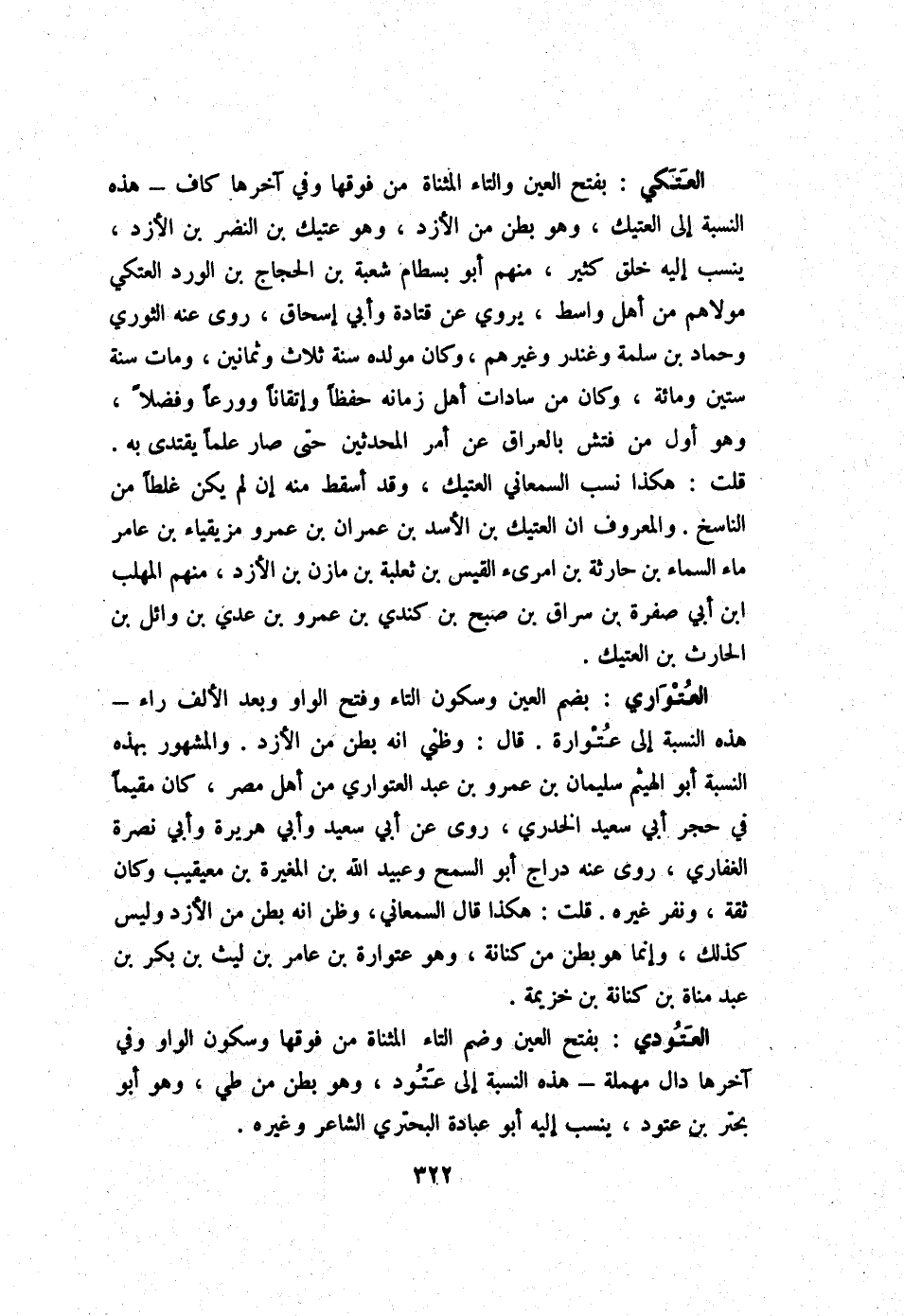 الْعَتكِي بِفَتْح الْعين وَالتَّاء الْمُثَنَّاة من فَوْقهَا وَفِي آخرهَا كَاف - هَذِه النِّسْبَة إِلَى العتيك وَهُوَ بطن من الأزد وَهُوَ عتِيك بن النَّضر بن الأزد ينْسب إِلَيْهِ خلق كثير مِنْهُم أَبُو بسطَام شُعْبَة بن الْحجَّاج بن الْورْد الْعَتكِي مَوْلَاهُم من أهل وَاسِط يروي عَن قَتَادَة وَأبي إِسْحَاق روى عَنهُ الثَّوْريّ وَحَمَّاد بن سَلمَة وغندر وَغَيرهم وَكَانَ مولده سنة ثَلَاث وَثَمَانِينَ وَمَات سنة سِتِّينَ وَمِائَة وَكَانَ من سَادَات أهل زَمَانه حفظا وإتقانا وورعا وفضلا وَهُوَ أول من فتش بالعراق عَن أَمر الْمُحدثين حَتَّى صَار علما يقْتَدى بِهِ قلت هَكَذَا نسب السَّمْعَانِيّ العتيك وَقد أسقط مِنْهُ إِن لم يكن غَلطا من النَّاسِخ وَالْمَعْرُوف أَن العتيك بن الْأسد بن عمرَان بن عَمْرو مزيقياء بن عَامر مَاء السَّمَاء بن حَارِثَة بن امْرِئ الْقَيْس بن ثَعْلَبَة بن مَازِن بن الأزد مِنْهُم الْمُهلب ابْن أبي صفرَة بن سراق بن صبح بن كندي بن عَمْرو بن عدي بن وَائِل بن الْحَارِث بن العتيك