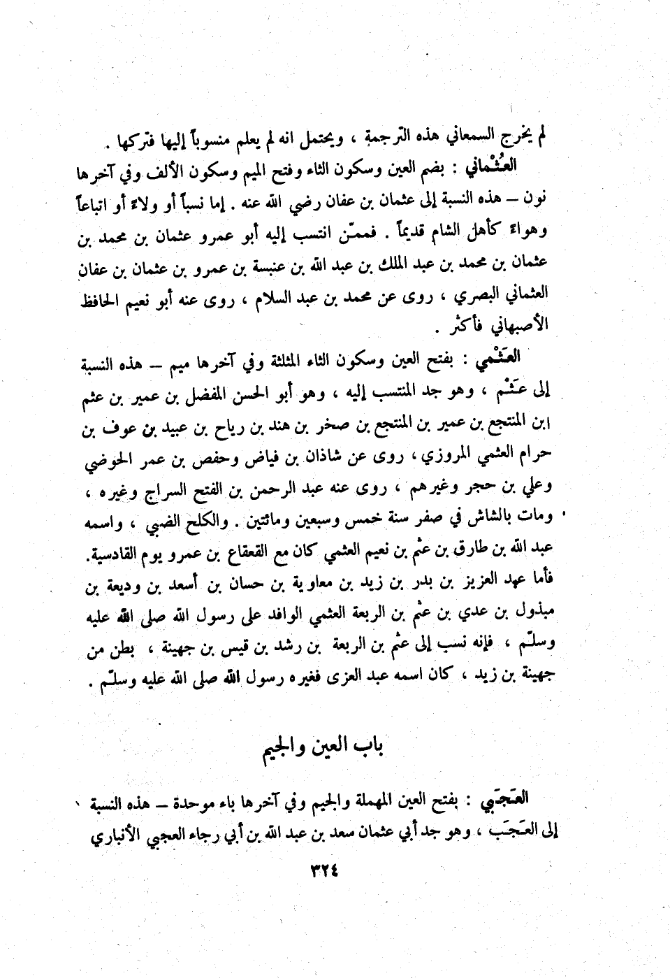 العثمي بِفَتْح الْعين وَسُكُون الثَّاء الْمُثَلَّثَة وَفِي آخرهَا مِيم - هَذِه النِّسْبَة إِلَى عثم وَهُوَ جد المنتسب إِلَيْهِ وَهُوَ أَبُو الْحسن الْمفضل بن عُمَيْر بن عثم ابْن المنتجع بن عُمَيْر بن المنتجع بن صَخْر بن هِنْد بن ريَاح بن عبيد بن عَوْف بن حرَام العثمي الْمروزِي روى عَن شَاذان بن فياض وَحَفْص بن عمر الحوضي وَعلي بن حجر وَغَيرهم روى عَنهُ عبد الرَّحْمَن بن الْفَتْح السراج وَغَيره وَمَات بالشاش فِي صفر سنة خمس وَسبعين وَمِائَتَيْنِ والكلح الضَّبِّيّ واسْمه عبد الله بن طَارق بن عثم بن نعيم العثمي كَانَ مَعَ الْقَعْقَاع بن عَمْرو يَوْم الْقَادِسِيَّة فَأَما عبد الْعَزِيز بن بدر بن زيد بن مُعَاوِيَة بن حسان بن أسعد بن وَدِيعَة بن مبذول بن عدي بن عثم بن الربعة العثمي الْوَافِد على رَسُول الله صلى الله عَلَيْهِ وَسلم فَإِنَّهُ نسب إِلَى عثم بن الربعة بن رشد بن قيس بن جُهَيْنَة بطن من جُهَيْنَة بن زيد كَانَ اسْمه عبد الْعُزَّى فَغَيره رَسُول الله صلى الله عَلَيْهِ وَسلم