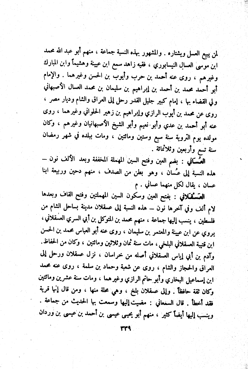 الْعَسْقَلَانِي بِفَتْح الْعين وَسُكُون السِّين الْمُهْمَلَتَيْنِ وَفتح الْقَاف وَبعدهَا لَام ألف وَفِي آخرهَا نون - هَذِه النِّسْبَة إِلَى عسقلان مَدِينَة بساحل الشَّام من فلسطين ينْسب إِلَيْهَا جمَاعَة مِنْهُم مُحَمَّد بن المتَوَكل بن أبي السّري الْعَسْقَلَانِي يروي عَن ابْن عُيَيْنَة والمعتمر بن سُلَيْمَان روى عَنهُ أَبُو الْعَبَّاس مُحَمَّد بن الْحسن ابْن قُتَيْبَة الْعَسْقَلَانِي الْبَلْخِي مَاتَ سنة ثَمَان وَثَلَاثِينَ وَمِائَتَيْنِ وَكَانَ من الْحفاظ وآدَم بن ابي إِيَاس الْعَسْقَلَانِي أَصله من خُرَاسَان نزل عسقلان ورحل إِلَى الْعرَاق والحجاز وَالشَّام روى عَن شُعْبَة وَحَمَّاد بن سَلمَة روى عَنهُ مُحَمَّد ابْن إِسْمَاعِيل البُخَارِيّ وَأَبُو حَاتِم الرَّازِيّ وَغَيرهمَا وَمَات سنة عشْرين وَمِائَتَيْنِ وَكَانَ ثِقَة حَافِظًا وَإِلَى عسقلان بَلخ وَهِي محلّة مِنْهَا وَمن قَالَ إِنَّهَا قَرْيَة فقد أَخطَأ قَالَ السَّمْعَانِيّ مضيت إِلَيْهَا وَسمعت بهَا الحَدِيث من جمَاعَة وينسب إِلَيْهَا أَيْضا كثير مِنْهُم أَبُو يحيى عِيسَى بن أَحْمد بن عِيسَى بن وردان