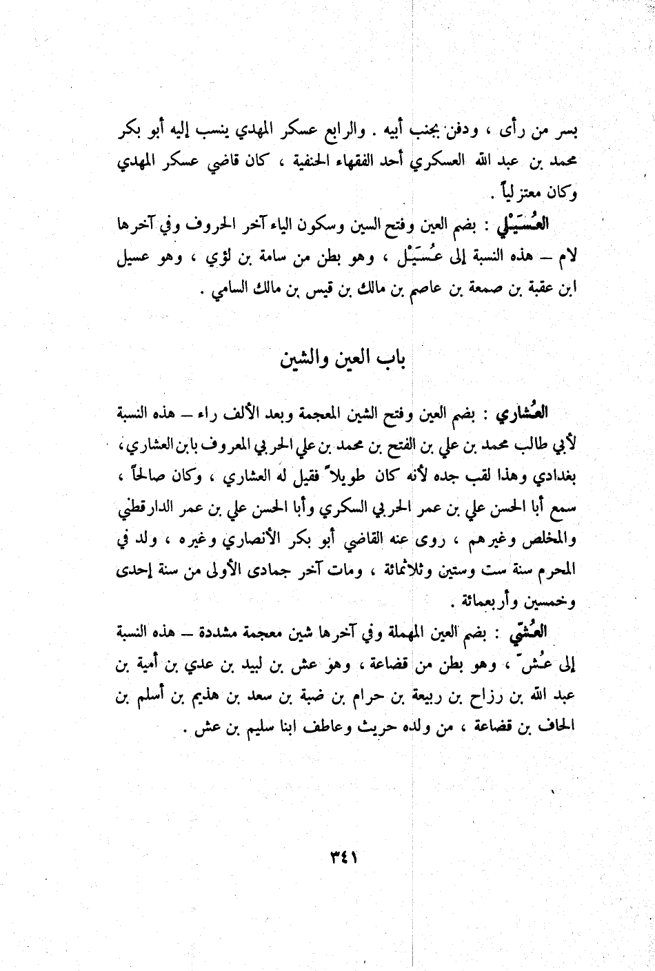 الْعشي بِضَم الْعين الْمُهْملَة وَفِي آخرهَا شين مُعْجمَة مُشَدّدَة - هَذِه النِّسْبَة إِلَى عش وَهُوَ بطن من قضاعة وَهُوَ عش بن لبيد بن عدي بن أُميَّة بن عبد الله بن رزاح بن ربيعَة بن حرَام بن ضبة بن سعد بن هذيم بن أسلم بن الحاف بن قضاعة من وَلَده حُرَيْث وعاطف ابْنا سليم بن عش