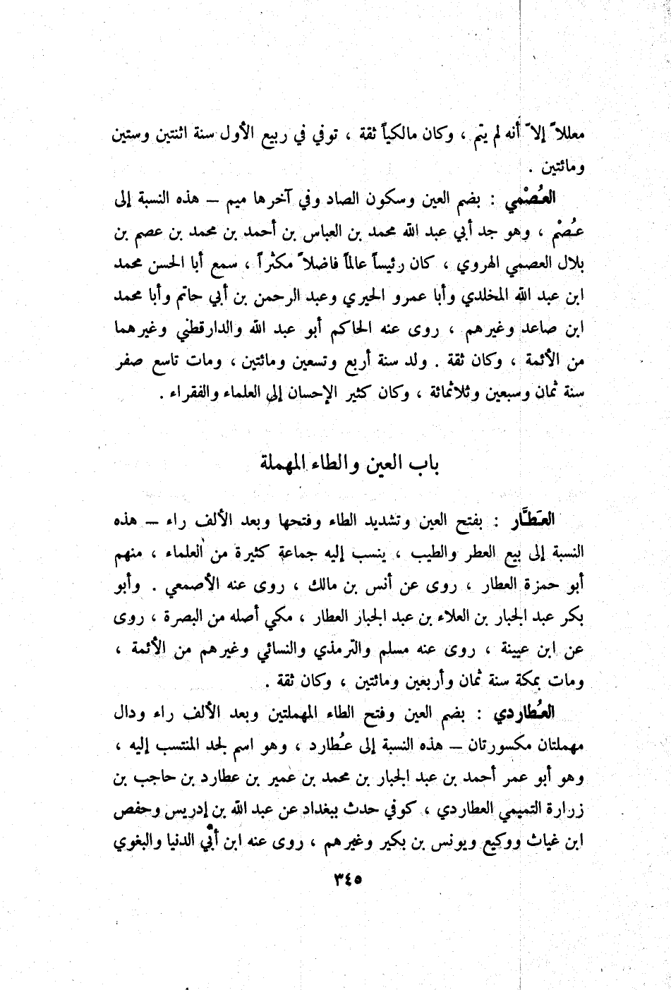 الْعَطَّار بِفَتْح الْعين وَتَشْديد الطَّاء وَفتحهَا وَبعد الْألف رَاء - هَذِه النِّسْبَة إِلَى بيع الْعطر وَالطّيب ينْسب إِلَيْهِ جمَاعَة كَثِيرَة من الْعلمَاء مِنْهُم أَبُو حَمْزَة الْعَطَّار روى عَن أنس بن مَالك روى عَنهُ الْأَصْمَعِي وَأَبُو بكر عبد الْجَبَّار بن الْعَلَاء بن عبد الْجَبَّار الْعَطَّار مكي أَصله من الْبَصْرَة روى عَن ابْن عُيَيْنَة روى عَنهُ مُسلم وَالتِّرْمِذِيّ وَالنَّسَائِيّ وَغَيرهم من الْأَئِمَّة وَمَات بِمَكَّة سنة ثَمَان وَأَرْبَعين وَمِائَتَيْنِ وَكَانَ ثِقَة
