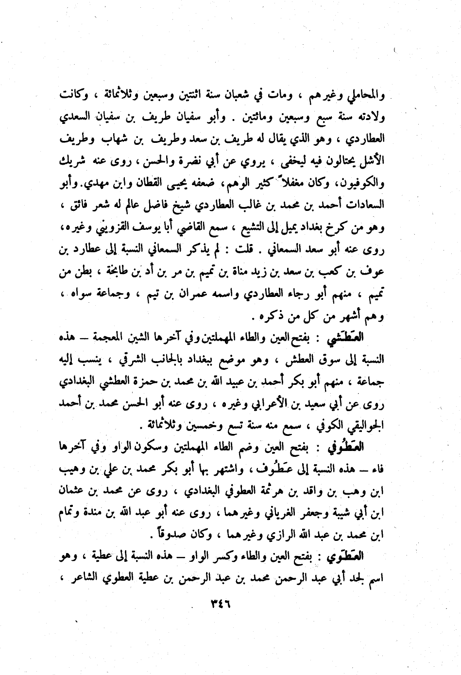 والمحاملي وَغَيرهم وَمَات فِي شعْبَان سنة اثْنَتَيْنِ وَسبعين وثلاثمائة وَكَانَت وِلَادَته سنة سبع وَسبعين وَمِائَتَيْنِ وَأَبُو سُفْيَان طريف بن سُفْيَان السَّعْدِيّ العطاردي وَهُوَ الَّذِي يُقَال لَهُ طريف بن سعد وطريف بن شهَاب وطريف الأشل يحتالون فِيهِ ليخفى يروي عَن أبي نَضرة وَالْحسن روى عَنهُ شريك والكوفيون وَكَانَ مغفلا كثير الْوَهم ضعفه يحيى الْقطَّان وَابْن مهْدي وَأَبُو السعادات أَحْمد بن مُحَمَّد بن غَالب العطاردي شيخ فَاضل عَالم لَهُ شعر فائق وَهُوَ من كرخ بَغْدَاد يمِيل إِلَى التَّشَيُّع سمع القَاضِي أَبَا يُوسُف الْقزْوِينِي وَغَيره روى عَنهُ أَبُو سعد السَّمْعَانِيّ قلت لم يذكر السَّمْعَانِيّ النِّسْبَة إِلَى عُطَارِد بن عَوْف بن كَعْب بن سعد بن زيد مَنَاة بن تَمِيم بن مر بن أد بن طابخة بطن من تَمِيم مِنْهُم أَبُو رَجَاء العطاردي واسْمه عمرَان بن تيم وَجَمَاعَة سواهُ وهم أشهر من كل من ذكره