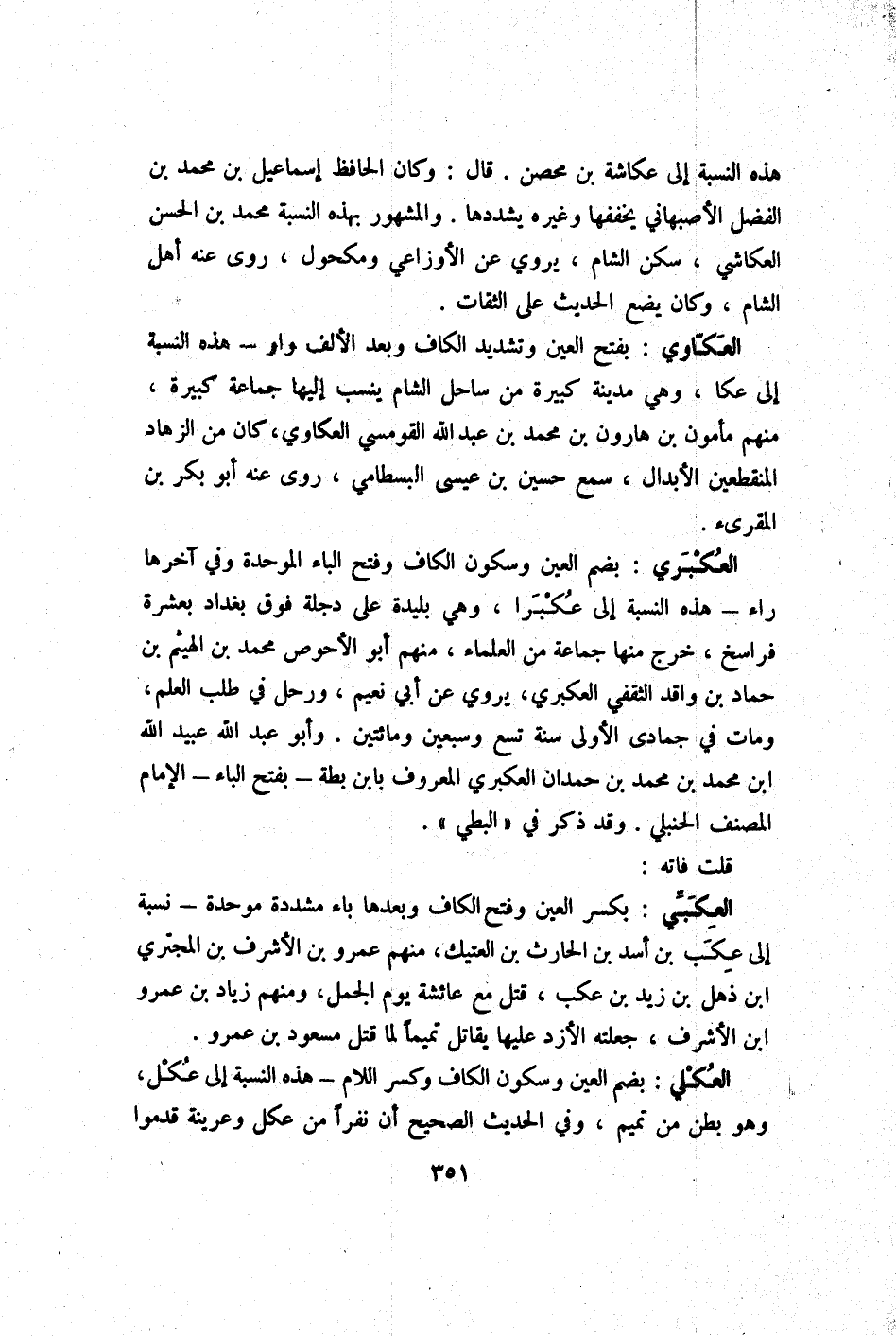 العكبري بِضَم الْعين وَسُكُون الْكَاف وَفتح الْبَاء الْمُوَحدَة وَفِي آخرهَا رَاء - هَذِه النِّسْبَة إِلَى عكبرا وَهِي بليدَة على دجلة فَوق بَغْدَاد بِعشْرَة فراسخ خرج مِنْهَا جمَاعَة من الْعلمَاء مِنْهُم أَبُو الْأَحْوَص مُحَمَّد بن الْهَيْثَم بن حَمَّاد بن وَاقد الثَّقَفِيّ العكبري يروي عَن أبي نعيم ورحل فِي طلب الْعلم وَمَات فِي جُمَادَى الأولى سنة تسع وَسبعين وَمِائَتَيْنِ وَأَبُو عبد الله عبيد الله ابْن مُحَمَّد بن مُحَمَّد بن حمدَان العكبري الْمَعْرُوف بِابْن بطة - بِفَتْح الْبَاء - الإِمَام المُصَنّف الْحَنْبَلِيّ وَقد ذكر فِي البطي