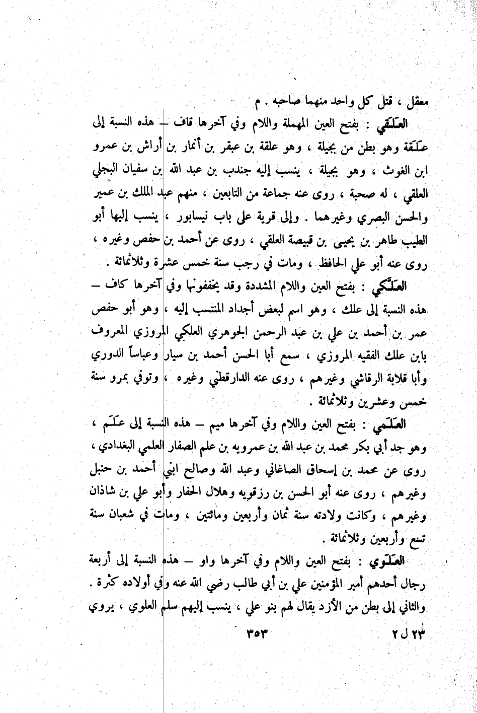 العلقي بِفَتْح الْعين الْمُهْملَة وَاللَّام وَفِي آخرهَا قَاف - هَذِه النِّسْبَة إِلَى علقَة وَهُوَ بطن من بجيلة وَهُوَ علقَة بن عبقر بن أَنْمَار بن أراش بن عَمْرو ابْن الْغَوْث وَهُوَ بجيلة ينْسب إِلَيْهِ جُنْدُب بن عبد الله بن سُفْيَان البَجلِيّ العلقي لَهُ صُحْبَة روى عَنهُ جمَاعَة من التَّابِعين مِنْهُم عبد الْملك بن عُمَيْر وَالْحسن الْبَصْرِيّ وَغَيرهمَا وَإِلَى قَرْيَة على بَاب نيسابور ينْسب إِلَيْهَا أَبُو الطّيب طَاهِر بن يحيى بن قبيصَة العلقي روى عَن أَحْمد بن حَفْص وَغَيره روى عَنهُ أَبُو عَليّ الْحَافِظ وَمَات فِي رَجَب سنة خمس عشرَة وثلاثمائة