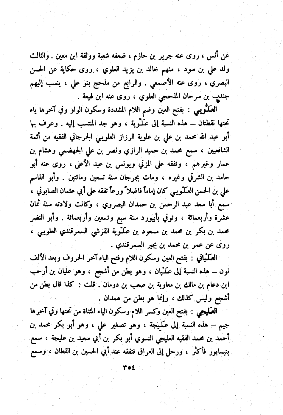 العلويي بِفَتْح الْعين وَضم اللَّام الْمُشَدّدَة وَسُكُون الْوَاو وَفِي آخرهَا يَاء تحتهَا نقطتان - هَذِه النِّسْبَة إِلَى علوِيَّة وَهُوَ جد المنتسب إِلَيْهِ وَعرف بهَا أَبُو عبد الله مُحَمَّد بن عَليّ بن علوِيَّة الرزاز العلويي الْجِرْجَانِيّ الْفَقِيه من أَئِمَّة الشافعيين سمع مُحَمَّد بن حميد الرَّازِيّ وَنصر بن عَليّ الْجَهْضَمِي وَهِشَام بن عمار وَغَيرهم وتفقه على الْمُزنِيّ وَيُونُس بن عبد الْأَعْلَى روى عَنهُ أَبُو حَامِد بن الشَّرْقِي وَغَيره وَمَات بجرجان سنة تسعين وَمِائَتَيْنِ وَأَبُو الْقَاسِم عَليّ بن الْحسن العلويي كَانَ إِمَامًا فَاضلا ورعا تفقه على أبي عُثْمَان الصَّابُونِي سمع أَبَا سعد عبد الرَّحْمَن بن حمدَان البصروي وَكَانَت وِلَادَته سنة ثَمَان عشرَة وَأَرْبَعمِائَة وَتُوفِّي بأبيورد سنة سبع وَتِسْعين وَأَرْبَعمِائَة وَأَبُو النَّضر مُحَمَّد بن بكر بن مُحَمَّد بن مَسْعُود بن علوِيَّة الْقرشِي السَّمرقَنْدِي العلويي روى عَن عمر بن مُحَمَّد بن بجير السَّمرقَنْدِي