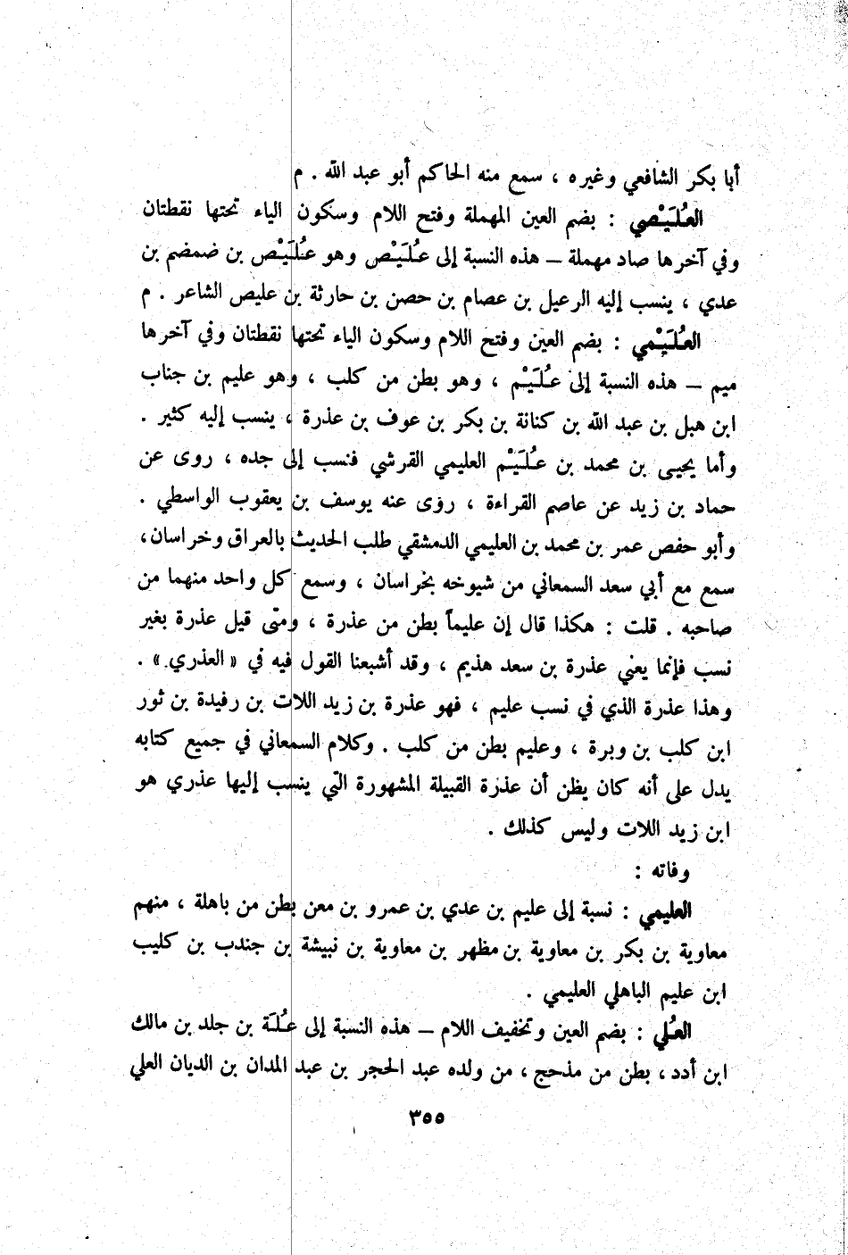 العليمي بِضَم الْعين وَفتح اللَّام وَسُكُون الْيَاء تحتهَا نقطتان وَفِي آخرهَا مِيم - هَذِه النِّسْبَة إِلَى عليم وَهُوَ بطن من كلب وَهُوَ عليم بن جناب ابْن هُبل بن عبد الله بن كنَانَة بن بكر بن عَوْف بن عذرة ينْسب إِلَيْهِ كثير وَأما يحيى بن مُحَمَّد بن عليم العليمي الْقرشِي فنسب إِلَى جده روى عَن حَمَّاد بن زيد عَن عَاصِم الْقِرَاءَة روى عَنهُ يُوسُف بن يَعْقُوب الوَاسِطِيّ وَأَبُو حَفْص عمر بن مُحَمَّد بن العليمي الدِّمَشْقِي طلب الحَدِيث بالعراق وخراسان سمع مَعَ أبي سعد السَّمْعَانِيّ من شُيُوخه بخراسان وَسمع كل وَاحِد مِنْهُمَا من صَاحبه قلت هَكَذَا قَالَ إِن عليما بطن من عذرة وَمَتى قيل عذرة بِغَيْر نسب فَإِنَّمَا يَعْنِي عذرة بن سعد هذيم وَقد أشبعنا القَوْل فِيهِ فِي العذري وَهَذَا عذرة الَّذِي فِي نسب عليم وَهُوَ عذرة بن زيد اللات بن رفيدة بن ثَوْر ابْن كلب بن وبرة وَعَلِيم بطن من كلب وَكَلَام السَّمْعَانِيّ فِي جَمِيع كِتَابه يدل على أَنه كَانَ يظنّ أَن عذرة الْقَبِيلَة الْمَشْهُورَة الَّتِي ينْسب إِلَيْهَا عُذْري هُوَ ابْن زيد اللات وَلَيْسَ كَذَلِك