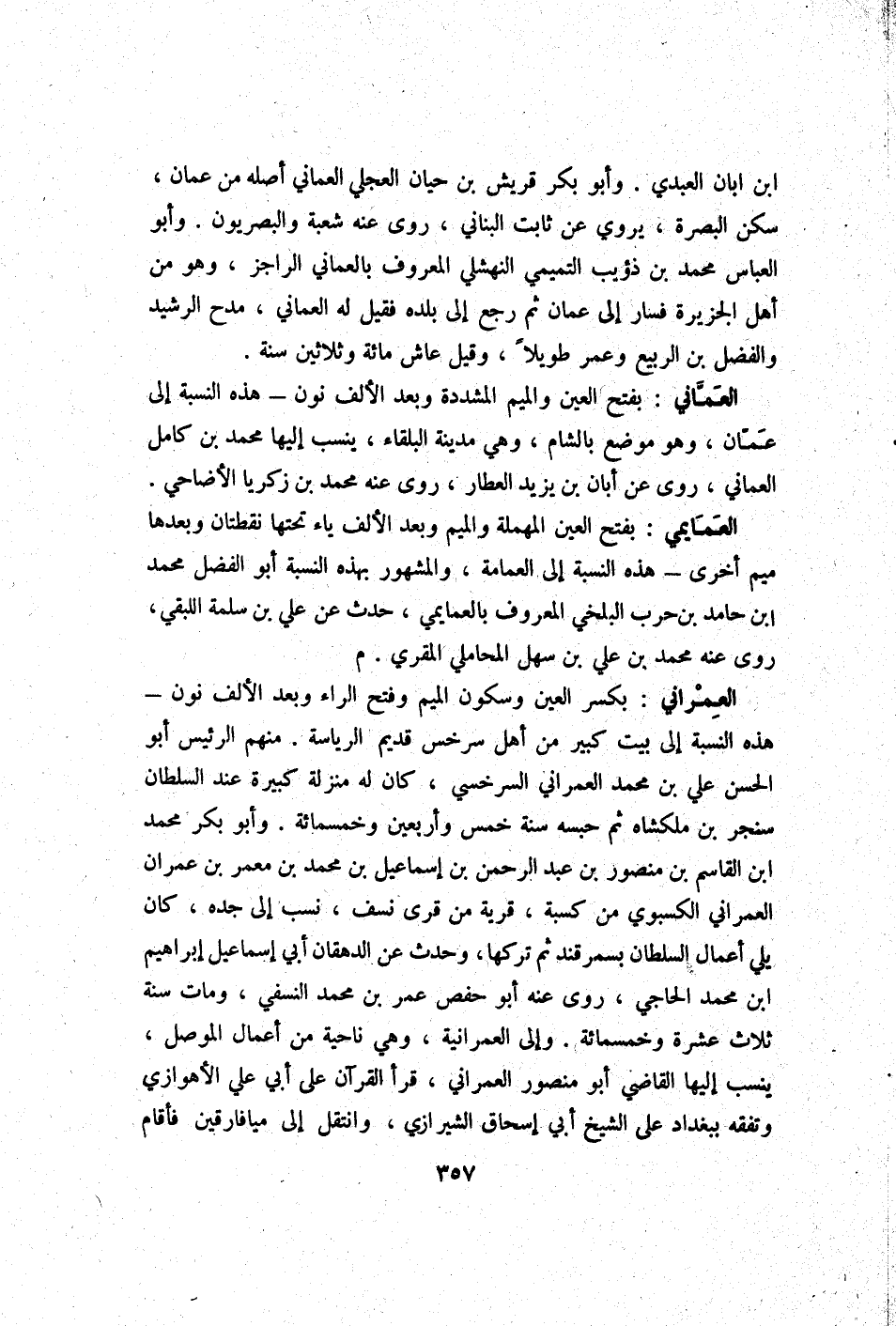 الْعمانِي بِفَتْح الْعين وَالْمِيم الْمُشَدّدَة وَبعد الْألف نون - هَذِه النِّسْبَة إِلَى عمان وَهُوَ مَوضِع بِالشَّام وَهِي مَدِينَة البلقاء ينْسب إِلَيْهَا مُحَمَّد بن كَامِل الْعمانِي روى عَن أبان بن يزِيد الْعَطَّار روى عَنهُ مُحَمَّد بن زَكَرِيَّا الْأَضَاحِي