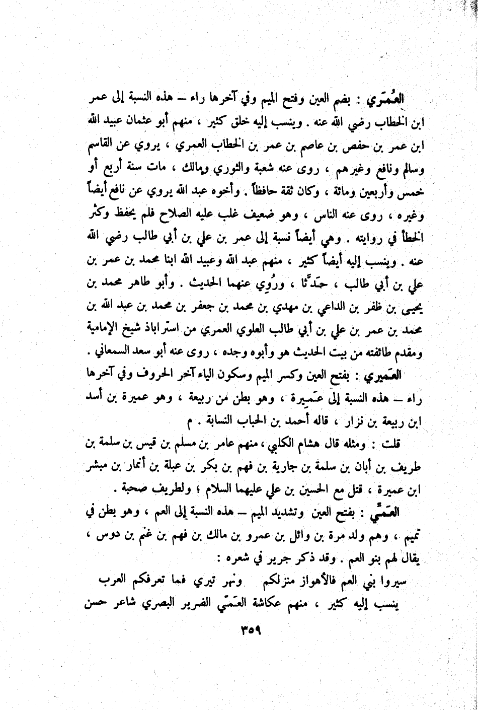 الْعمريّ بِضَم الْعين وَفتح الْمِيم وَفِي آخرهَا رَاء - هَذِه النِّسْبَة إِلَى عمر ابْن الْخطاب رَضِي الله عَنهُ وينسب إِلَيْهِ خلق كثير مِنْهُم أَبُو عُثْمَان عبيد الله ابْن عمر بن حَفْص بن عَاصِم بن عمر بن الْخطاب الْعمريّ يروي عَن الْقَاسِم وَسَالم وَنَافِع وَغَيرهم روى عَنهُ شُعْبَة وَالثَّوْري وَمَالك مَاتَ سنة أَربع أَو خمس وَأَرْبَعين وَمِائَة وَكَانَ ثِقَة حَافِظًا وَأَخُوهُ عبد الله يروي عَن نَافِع أَيْضا وَغَيره روى عَنهُ النَّاس وَهُوَ ضَعِيف غلب عَلَيْهِ الصّلاح فَلم يحفظ وَكثر الْخَطَأ فِي رِوَايَته وَهِي أَيْضا نِسْبَة إِلَى عمر بن عَليّ بن أبي طَالب رَضِي الله عَنهُ وينسب إِلَيْهِ ايضا كثير مِنْهُم عبد الله وَعبيد الله ابْنا مُحَمَّد بن عمر بن عَليّ بن أبي طَالب حَدثا وَرُوِيَ عَنْهُمَا الحَدِيث وَأَبُو طَاهِر مُحَمَّد بن يحيى بن ظفر بن الدَّاعِي بن مهْدي بن مُحَمَّد بن جَعْفَر بن مُحَمَّد بن عبد الله بن مُحَمَّد بن عمر بن عَليّ بن أبي طَالب الْعلوِي الْعمريّ من استراباذ شيخ الإمامية ومقدم طائفته من بَيت الحَدِيث هُوَ وَأَبوهُ وجده روى عَنهُ أَبُو سعد السَّمْعَانِيّ