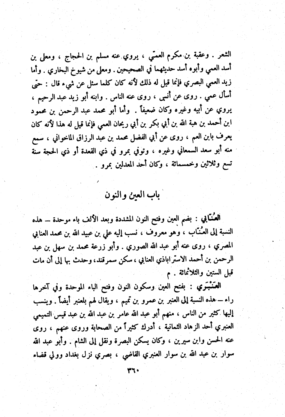 الشّعْر وَعقبَة بن مكرم الْعمي يروي عَنهُ مُسلم بن الْحجَّاج وَمعلى بن أَسد الْعمي وَأَبوهُ أَسد حَدِيثهمَا فِي الصَّحِيحَيْنِ وَمعلى من شُيُوخ البُخَارِيّ وَأما زيد الْعمي الْبَصْرِيّ فَإِنَّمَا قيل لَهُ ذَلِك لِأَنَّهُ كَانَ كلما سُئِلَ عَن شَيْء قَالَ حَتَّى أسأَل عمي روى عَن أنس روى عَنهُ النَّاس وَابْنه أَبُو زيد عبد الرَّحِيم يروي عَن أَبِيه وَغَيره وَكَانَ ضَعِيفا وَأما أَبُو مُحَمَّد عبد الرَّحْمَن بن مَحْمُود ابْن أَحْمد بن هبة الله بن أبي بكر بن أبي ريحَان الْعمي فَإِنَّمَا قيل لَهُ هَذَا لِأَنَّهُ كَانَ يعرف بِابْن الْعم روى عَن ابي الْفضل مُحَمَّد بن عبد الرَّزَّاق الماخواني سمع مِنْهُ أَبُو سمعد السَّمْعَانِيّ وَغَيره وَتُوفِّي بمرو فِي ذِي الْقعدَة أَو ذِي الْحجَّة سنة تسع وَثَلَاثِينَ وَخَمْسمِائة وَكَانَ أحد المعدلين بمرو