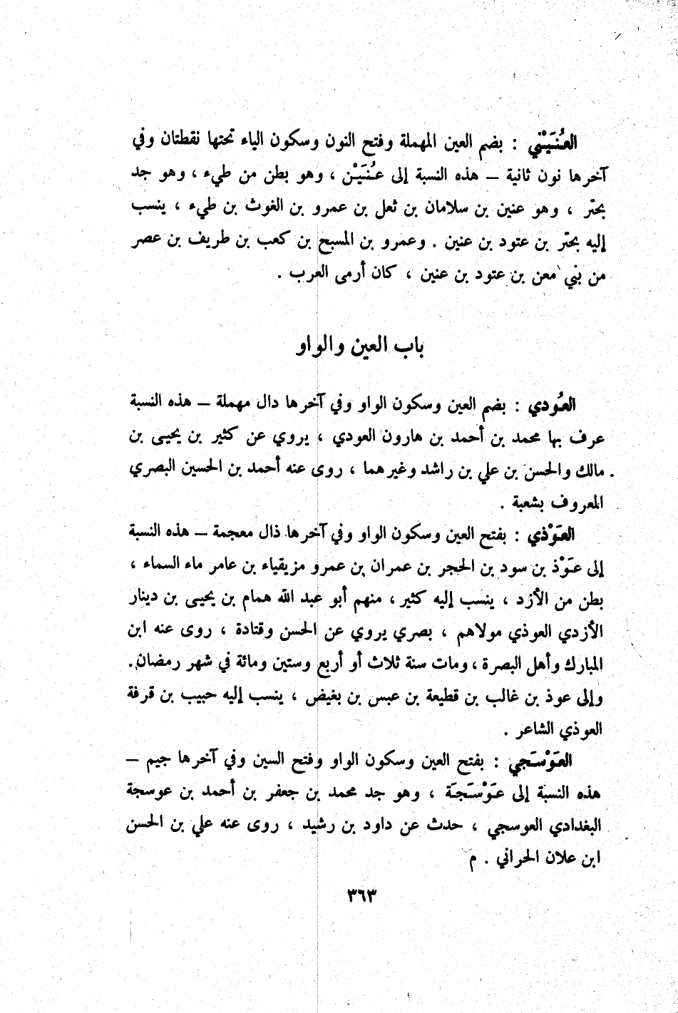العنيني بِضَم الْعين الْمُهْملَة وَفتح النُّون وَسُكُون الْيَاء تحتهَا نقطتان وَفِي آخرهَا نون ثَانِيَة - هَذِه النِّسْبَة إِلَى عنين وَهُوَ بطن من طَيء وَهُوَ جد بحتر وَهُوَ عنين بن سلامان بن ثعل بن عَمْرو بن الْغَوْث بن طَيء ينْسب إِلَيْهِ بحتر بن عتود بن عنين وَعَمْرو بن المسبح بن كَعْب بن طريف بن عصر من بني معن بن عتود بن عنين كَانَ أرمى الْعَرَب