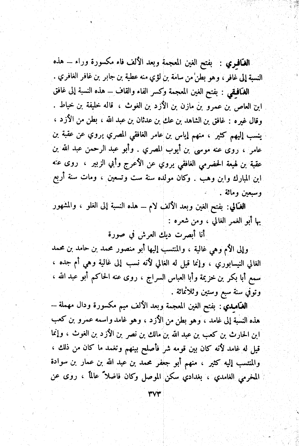 الغامدي بِفَتْح الْغَيْن الْمُعْجَمَة وَبعد الْألف مِيم مَكْسُورَة ودال مُهْملَة - هَذِه النِّسْبَة إِلَى غامد وَهُوَ بطن من الأزد وَهُوَ غامد واسْمه عَمْرو بن كَعْب ابْن الْحَارِث بن كَعْب بن عبد الله بن مَالك بن نصر بن الأزد بن الْغَوْث وَإِنَّمَا قيل لَهُ غامد لِأَنَّهُ كَانَ بَين قومه شَرّ فَأصْلح بَينهم وتغمد مَا كَانَ من ذَلِك والمنتسب إِلَيْهِ كثير مِنْهُم أَبُو جَعْفَر مُحَمَّد بن عبد الله بن عمار بن سوَادَة المخرمي الغامدي بغدادي سكن الْموصل وَكَانَ فَاضلا عَالما روى عَن