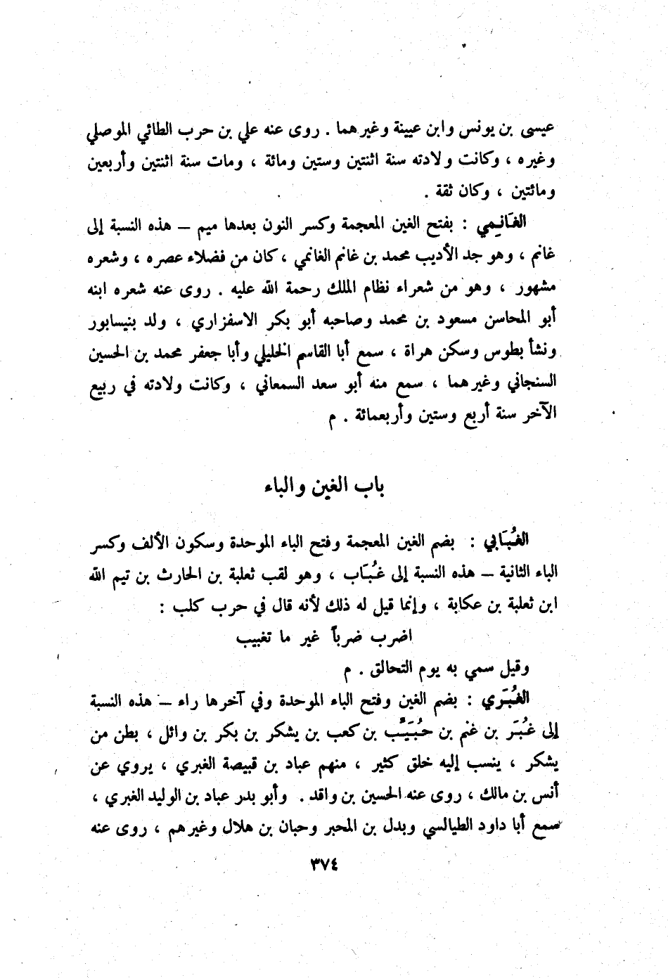الغبابي بِضَم الْغَيْن الْمُعْجَمَة وَفتح الْبَاء الْمُوَحدَة وَسُكُون الْألف وَكسر الْبَاء الثَّانِيَة - هَذِه النِّسْبَة إِلَى غباب وَهُوَ لقب ثَعْلَبَة بن الْحَارِث بن تيم الله ابْن ثَعْلَبَة بن عكابة وَإِنَّمَا قيل لَهُ ذَلِك لِأَنَّهُ قَالَ فِي حَرْب كلب