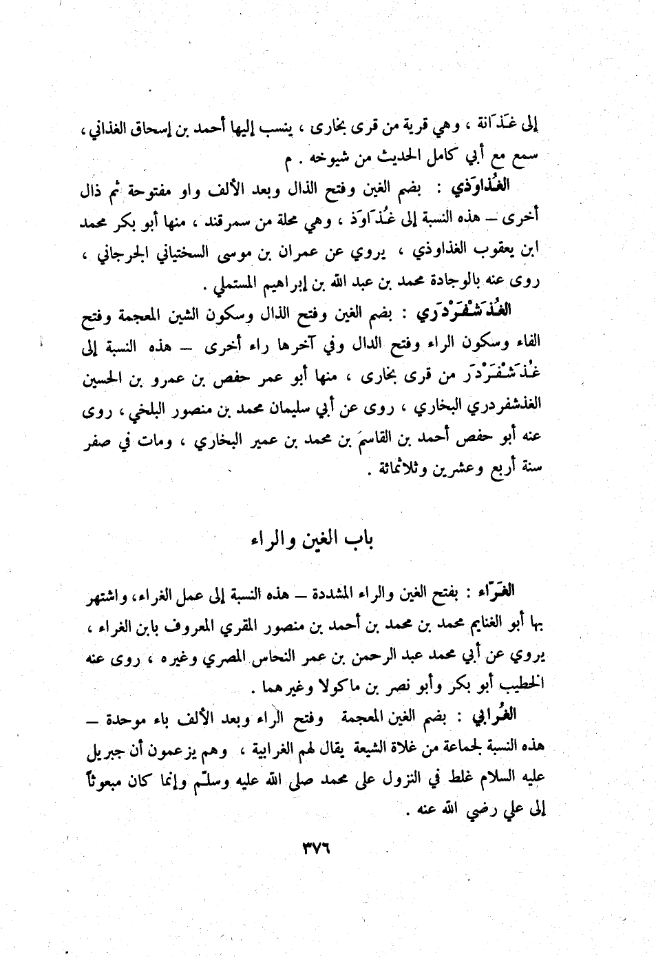 الغراء بِفَتْح الْغَيْن وَالرَّاء الْمُشَدّدَة - هَذِه النِّسْبَة إِلَى عمل الغراء واشتهر بهَا أَبُو الغنايم مُحَمَّد بن مُحَمَّد بن أَحْمد بن مَنْصُور الْمقري الْمَعْرُوف بِابْن الغراء يروي عَن أبي مُحَمَّد عبد الرَّحْمَن بن عمر النّحاس الْمصْرِيّ وَغَيره روى عَنهُ الْخَطِيب أَبُو بكر وَأَبُو نصر بن مَاكُولَا وَغَيرهم ا