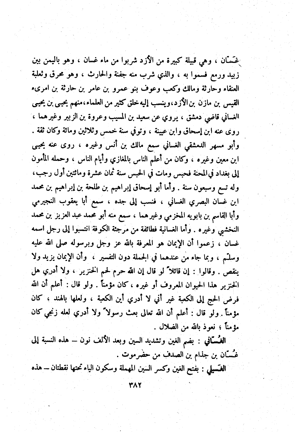غَسَّان وَهِي قَبيلَة كَبِيرَة من الأزد شربوا من مَاء غَسَّان وَهُوَ بِالْيمن بَين زبيد ورمع فسموا بِهِ وَالَّذِي شرب مِنْهُ جَفْنَة والْحَارث وَهُوَ محرق وثعلبة العنقاء وحارثة وَمَالك وَكَعب وعَوْف بَنو عَمْرو بن عَامر بن حَارِثَة بن امْرِئ الْقَيْس بن مَازِن بن الأزد وينسب إِلَيْهِ خلق كثير من الْعلمَاء مِنْهُم يحيى بن يحيى الغساني قَاضِي دمشق يروي عَن سعيد بن الْمسيب وَعُرْوَة بن الزبير وَغَيرهمَا روى عَنهُ ابْن إِسْحَاق وَابْن عُيَيْنَة وَتُوفِّي سنة خمس وَثَلَاثِينَ وَمِائَة وَكَانَ ثِقَة وَأَبُو مسْهر الدِّمَشْقِي الغساني سمع مَالك بن أنس وَغَيره روى عَنهُ يحيى ابْن معِين وَغَيره وَكَانَ من أعلم النَّاس بالمغازي وَأَيَّام النَّاس وَحمله الْمَأْمُون إِلَى بَغْدَاد فِي المحنة فحبس وَمَات فِي الْحَبْس سنة ثَمَان عشرَة وَمِائَتَيْنِ أول رَجَب وَله تسع وَسَبْعُونَ سنة وَأما أَبُو إِسْحَاق إِبْرَاهِيم بن طَلْحَة بن إِبْرَاهِيم بن مُحَمَّد ابْن غَسَّان الْبَصْرِيّ الغساني فنسب إِلَى جده سمع أَبَا يَعْقُوب النجيرمي وَأَبا الْقَاسِم بن بابويه المخزمي وَغَيرهمَا سمع مِنْهُ أَبُو مُحَمَّد عبد الْعَزِيز بن مُحَمَّد النخشبي وَغَيره وَأما الغسانية فطائفة من مرجئة بِالْكُوفَةِ انتسبوا إِلَى رجل اسْمه غَسَّان زَعَمُوا أَن الْإِيمَان هُوَ الْمعرفَة بِاللَّه عز وَجل وبرسوله صلى الله عَلَيْهِ وَسلم وَبِمَا جَاءَ من عِنْدهمَا فِي الْجُمْلَة دون التَّفْسِير وَأَن الْإِيمَان يزِيد وَلَا ينقص وَقَالُوا إِن قَائِلا لَو قَالَ إِن الله حرم لحم الْخِنْزِير وَلَا أَدْرِي هَل الْخِنْزِير هَذَا الْحَيَوَان الْمَعْرُوف أَو غَيره كَانَ مُؤمنا وَلَو قَالَ أعلم أَن الله فرض الْحَج إِلَى الْكَعْبَة غير أَنِّي لَا أَدْرِي أَيْن الْكَعْبَة ولعلها بِالْهِنْدِ كَانَ مُؤمنا وَلَو قَالَ أعلم أَن الله تَعَالَى بعث رَسُولا وَلَا أَدْرِي لَعَلَّه زنجي كَانَ مُؤمنا نَعُوذ بِاللَّه من الضلال