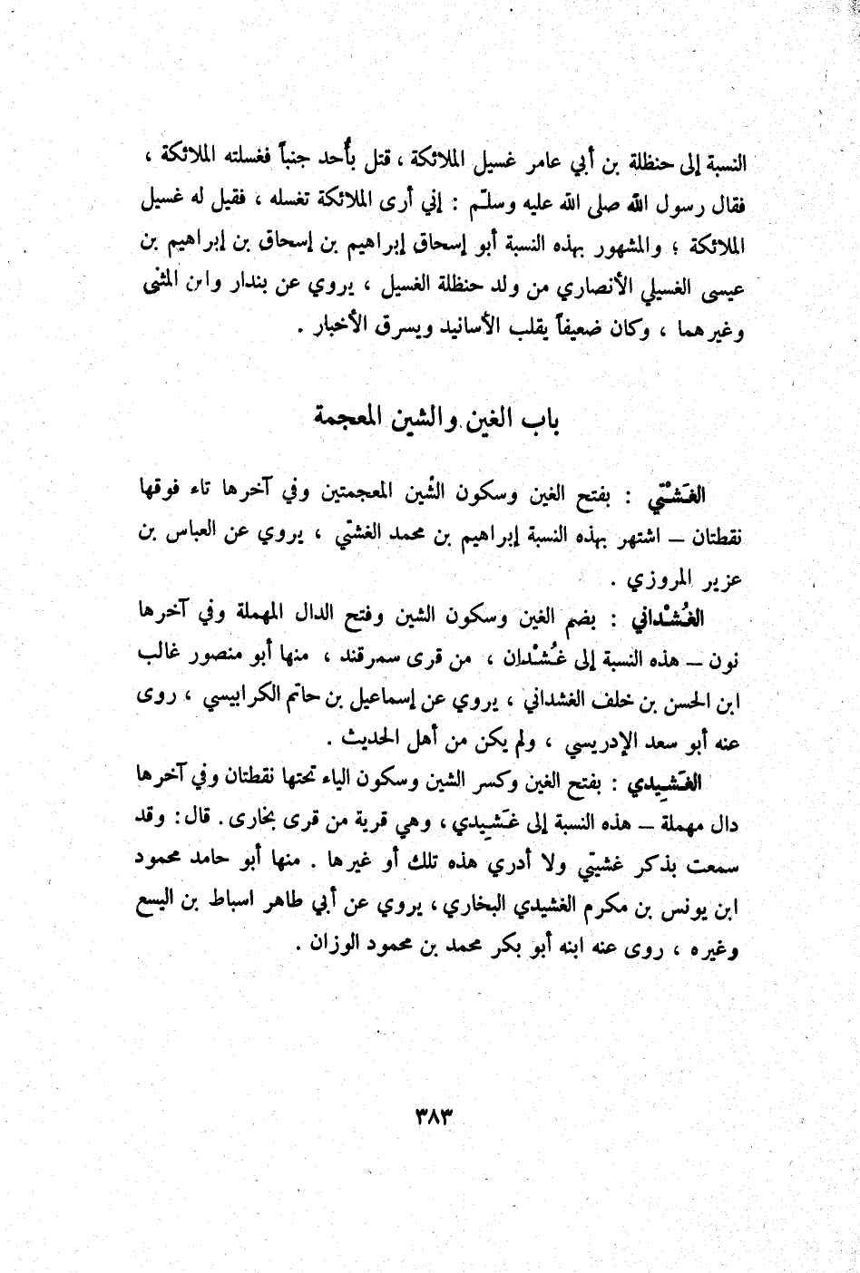 النِّسْبَة إِلَى حَنْظَلَة بن أبي عَامر غسيل الْمَلَائِكَة قتل بِأحد جنبا فغسلته الْمَلَائِكَة فَقَالَ رَسُول الله صلى الله عَلَيْهِ وَسلم إِنِّي ارى الْمَلَائِكَة تغسله فَقيل لَهُ غسيل الْمَلَائِكَة وَالْمَشْهُور بِهَذِهِ النِّسْبَة أَبُو إِسْحَاق إِبْرَاهِيم بن إِسْحَاق بن إِبْرَاهِيم بن عِيسَى الْغَسِيلِيِّ الْأنْصَارِيّ من ولد حَنْظَلَة الغسيل يروي عَن بنْدَار وَابْن الْمثنى وَغَيرهمَا وَكَانَ ضَعِيفا يقلب الْأَسَانِيد وَيسْرق الْأَخْبَار