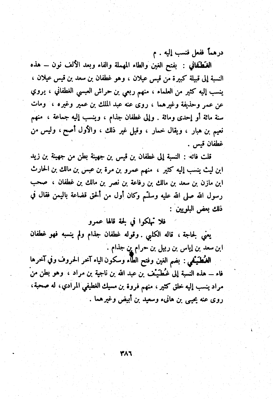قلت فَاتَهُ النِّسْبَة إِلَى غطفان بن قيس بن جُهَيْنَة بطن من جُهَيْنَة بن زيد ابْن لَيْث ينْسب إِلَيْهِ كثير مِنْهُم عَمْرو بن مرّة بن عبس بن مَالك بن الْحَارِث ابْن مَازِن بن سعد بن مَالك بن رِفَاعَة بن نصر بن مَالك بن غطفان صحب رَسُول الله صلى الله عَلَيْهِ وَسلم وَكَانَ أول من ألحق قضاعة بِالْيمن فَقَالَ فِي ذَلِك بعض البلويين