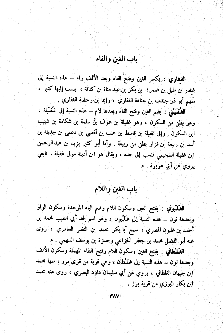 الْغِفَارِيّ بِكَسْر الْغَيْن وَفتح الْفَاء وَبعد الْألف رَاء - هَذِه النِّسْبَة إِلَى غفار بن مليل بن ضَمرَة بن بكر بن عبد مَنَاة بن كنَانَة ينْسب إِلَيْهَا كثير مِنْهُم أَبُو ذَر جُنْدُب بن جُنَادَة الْغِفَارِيّ وإيما بن رحضة الْغِفَارِيّ