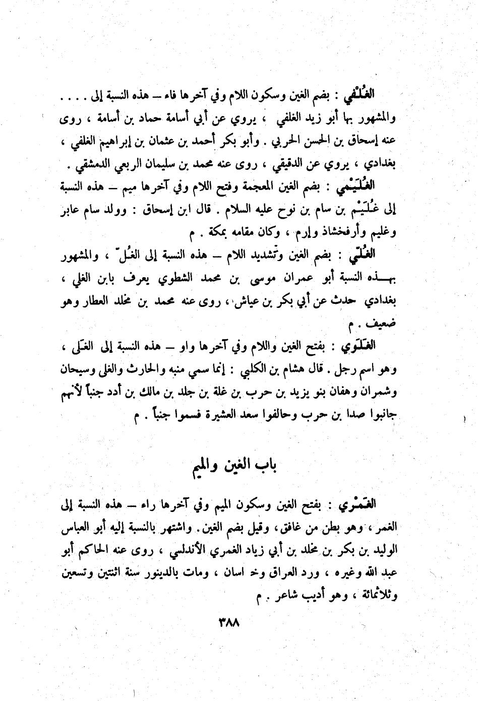 الغلي بِضَم الْغَيْن وَتَشْديد اللَّام - هَذِه النِّسْبَة إِلَى الغل وَالْمَشْهُور بِهَذِهِ النِّسْبَة أَبُو عمرَان مُوسَى بن مُحَمَّد الشطوي يعرف بِابْن الغلي بغدادي حدث عَن أبي بكر بن عَيَّاش روى عَنهُ مُحَمَّد بن مخلد الْعَطَّار وَهُوَ ضَعِيف م
