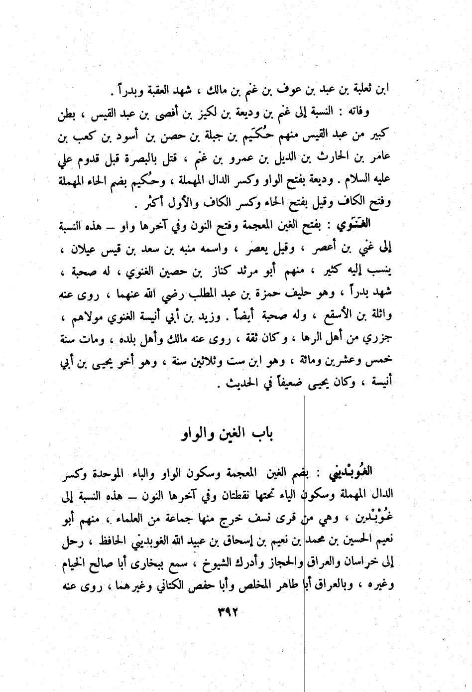 الغنوي بِفَتْح الْغَيْن الْمُعْجَمَة وَفتح النُّون وَفِي آخرهَا وَاو - هَذِه النِّسْبَة إِلَى غَنِي بن أعصر وَقيل يعصر واسْمه مُنَبّه بن سعد بن قيس عيلان ينْسب إِلَيْهِ كثير مِنْهُم أَبُو مرْثَد كناز بن حُصَيْن الغنوي لَهُ صُحْبَة شهد بَدْرًا وَهُوَ حَلِيف حَمْزَة بن عبد الْمطلب رَضِي الله عَنْهُمَا روى عَنهُ وَاثِلَة ابْن الْأَسْقَع وَله صُحْبَة أَيْضا وَزيد بن أبي أنيسَة الغنوي مَوْلَاهُم جزري من أهل الرها وَكَانَ ثِقَة روى عَنهُ مَالك وَأهل بَلَده وَمَات سنة خمس وَعشْرين وَمِائَة وَهُوَ ابْن سِتّ وَثَلَاثِينَ سنة وَهُوَ أَخُو يحيى بن أبي أنيسَة وَكَانَ يحيى ضَعِيفا فِي الحَدِيث
