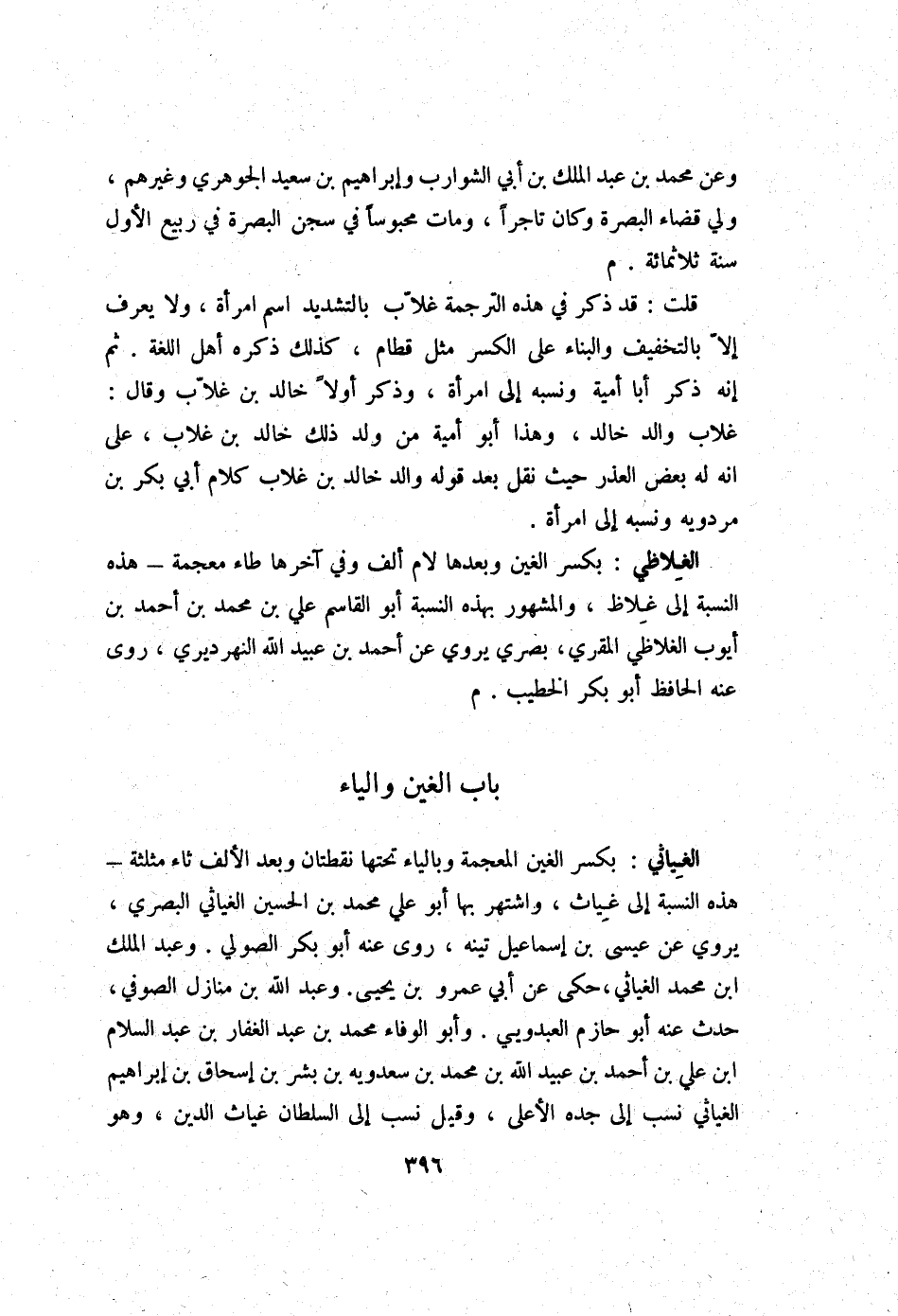 قلت قد ذكر فِي هَذِه التَّرْجَمَة غلاب بِالتَّشْدِيدِ اسْم امْرَأَة ولايعرف إِلَّا بِالتَّخْفِيفِ وَالْبناء على الْكسر مثل قطام كَذَلِك ذكره أهل اللُّغَة ثمَّ إِنَّه ذكر أَبَا أُميَّة وَنسبه إِلَى امْرَأَة وَذكر أَولا خَالِد بن غلاب وَقَالَ غلاب وَالِد خَالِد وَهَذَا أَبُو أُميَّة من ولد ذَلِك خَالِد بن غلاب على انه لَهُ بعض الْعذر حَيْثُ نقل بعد قَوْله وَالِد خَالِد بن غلاب كَلَام أبي بكر بن مرْدَوَيْه وَنسبه لإلى امْرَأَة
