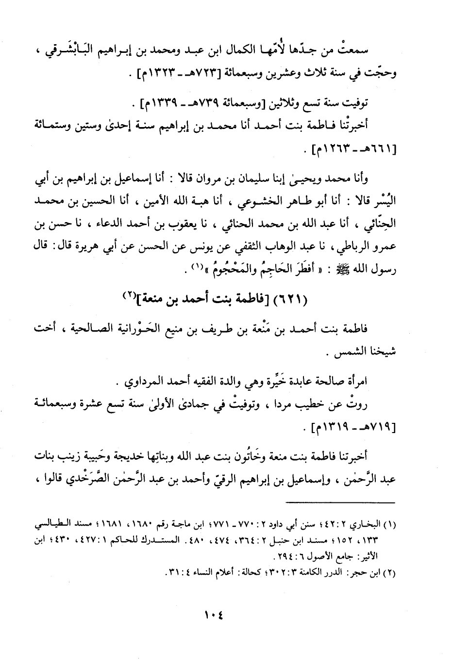 فَاطِمَةُ بِنْتُ أَحْمَدَ بْنِ مَنْعَةَ بْنِ طَرِيفِ بْنِ مَنِيعٍ الْحَوْرَانِيَّةُ الصَّالِحِيَّةُ أُخْتُ شَيْخِنَا الشَّمْسِ