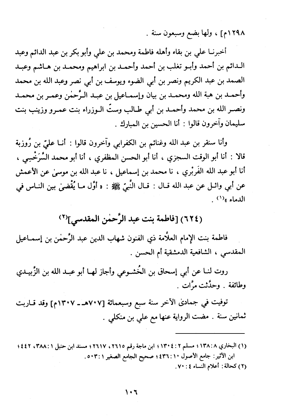 وَأَخْبَرَنَا سُنْقُرُ بْنُ عَبْدِ اللَّهِ، وَغَنَائِمُ بْنُ الْكَفْرَابِيِّ، وَآخَرُونَ، قَالُوا: أنا عَلِيُّ بْنُ رُوزْبَةَ، قَالا: أنا أَبُو الْوَقْتِ السِّجْزِيُّ، أنا أَبُو الْحَسَنِ الْمُظَفَّرِيُّ، أنا أَبُو مُحَمَّدٍ السَّرْخَسِيُّ، أنا أَبُو عَبْدِ اللَّهِ الْفَرَبْرِيُّ، نا مُحَمَّدُ بْنُ إِسْمَاعِيلَ، نا عَبْدُ اللَّهِ بْنُ مُوسَى، عَنِ الأَعْمَشِ، عَنْ أَبِي وَائِلٍ، عَنْ عَبْدِ اللَّهِ، قَالَ: قَالَ النَّبِيُّ صَلَّى اللَّهُ عَلَيْهِ وَسَلَّمَ: «أَوَّلُ مَا يُقْضَى بَيْنَ النَّاسِ فِي الدِّمَاءِ»