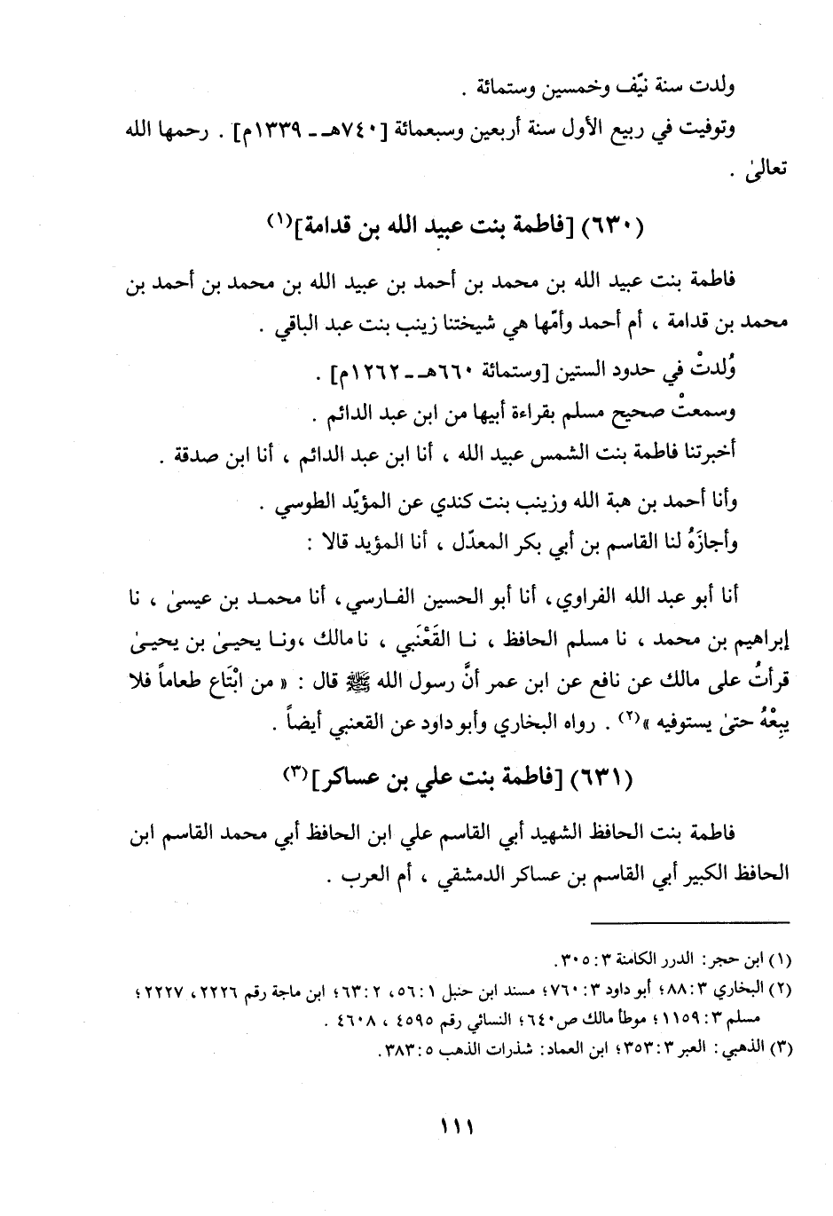 فَاطِمَةُ بِنْتُ عُبَيْدِ اللَّهِ بْنِ مُحَمَّدِ بْنِ أَحْمَدَ بْنِ عُبَيْدِ اللَّهِ بْنِ مُحَمَّدِ بْنِ أَحْمَدَ بْنِ مُحَمَّدِ بْنِ قُدَامَةَ أُمُّ أَحْمَدَ وَأُمُّهَا هِي شَيْخَتُنَا زَيْنَبُ بِنْتُ عَبْدِ الْبَاقِي