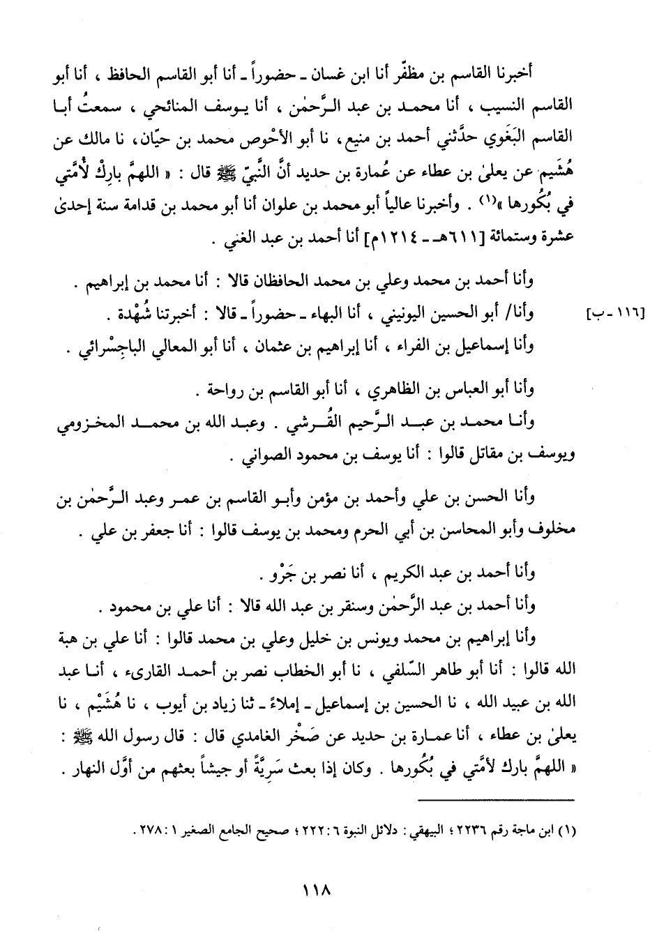 -10 - 1: 364 - وَأَخْبَرَنَا عَالِيًا أَبُو مُحَمَّدِ بْنُ عُلْوَانَ، أنا أَبُو مُحَمَّدِ بْنُ قُدَامَةَ، سَنَةَ إِحْدَى عَشْرَةَ وَسِتِّ مِائَةٍ، أنا أَحْمَدُ بْنُ عَبْدِ الْغَنِيِّ، وَأَخْبَرَنَا أَحْمَدُ بْنُ مُحَمَّدٍ، وَعَلِيُّ بْنُ مُحَمَّدٍ الْحَافِظَانِ، قَالا: أنا مُحَمَّدُ بْنُ إِبْرَاهِيمَ، وأنا أَبُو الْحُسَيْنِ الْيُونِينِيُّ، أنا الْبَهَاءُ، حُضُورًا، قَالا: أَخْبَرَتْنَا شُهْدَةُ، وَأَخْبَرَنَا إِسْمَاعِيلُ بْنُ الْفَرَّاءِ، أنا إِبْرَاهِيمُ بْنُ عُثْمَانَ، أنا أَبُو الْمَعَالِي الْبَاجِسْرَائِيُّ، وَأَخْبَرَنَا أَبُو الْعَبَّاسِ بْنُ الظَّاهِرِيِّ، أنا أَبُو الْقَاسِمِ بْنُ رَوَاحَةَ، وَأَنا مُحَمَّدُ بْنُ عَبْدِ الرَّحِيمِ الْقُرَشِيُّ، وَعَبْدُ اللَّهِ بْنُ مُحَمَّدٍ الْمَخْزُومِيُّ، وَيُوسُفُ بْنُ مُقَاتِلٍ، قَالُوا: أنا يُوسُفُ بْنُ مَحْمُودٍ الصّوَانِيُّ، وَأَخْبَرَنَا الْحَسَنُ بْنُ عَلِيٍّ، وَأَحْمَدُ بْنُ مُؤْمِنٍ، وَأَبُو الْقَاسِمِ بْنُ عُمَرَ، وَعَبْدُ الرَّحْمَنِ بْنُ مَخْلُوفٍ، وَأَبُو الْمَحَاسِنِ بْنُ أَبِي الْحَرَمِ، وَمُحَمَّدُ بْنُ يُوسُفَ، قَالُوا: أنا جَعْفَرُ بْنُ عَلِيٍّ، وَأَخْبَرَنَا أَحْمَدُ بْنُ عَبْدِ الْكَرِيمِ، أنا نَصْرُ بْنُ جَرْوٍ، وَأَخْبَرَنَا أَحْمَدُ بْنُ عَبْدِ الرَّحْمَنِ، وَسُنْقُرُ بْنُ عَبْدِ اللَّهِ، قَالا: أنا عَلِيُّ بْنُ مَحْمُودٍ وَأَخْبَرَنَا إِبْرَاهِيمُ بْنُ مُحَمَّدٍ، وَيُونُسُ بْنُ خَلِيلٍ، وَعَلِيُّ بْنُ مُحَمَّدٍ، قَالُوا: أنا عَلِيُّ بْنُ هِبَةِ اللَّهِ، قَالُوا: أنا أَبُو طَاهِرٍ السَّلَفِيُّ، نا أَبُو الْخَطَّابِ نَصْرُ بْنُ أَحْمَدَ الْقَارِئُ، أنا عَبْدُ اللَّهِ بْنُ عُبَيْدِ اللَّهِ، نا الْحُسَيْنُ بْنُ إِسْمَاعِيلَ، إِمْلاءً، ثنا زِيَادُ بْنُ أَيُّوبَ، نا هُشَيْمٌ، نا يَعْلَى بْنُ عَطَاءٍ، أنا عُمَارَةُ بْنُ حَدِيدٍ، عَنْ صَخْرٍ الْغَامِدِيِّ، قَالَ: قَالَ رَسُولُ اللَّهِ صَلَّى اللَّهُ عَلَيْهِ وَسَلَّمَ: «اللَّهُمَّ بَارِكْ لأُمَّتِي فِي بُكُورِهَا» .