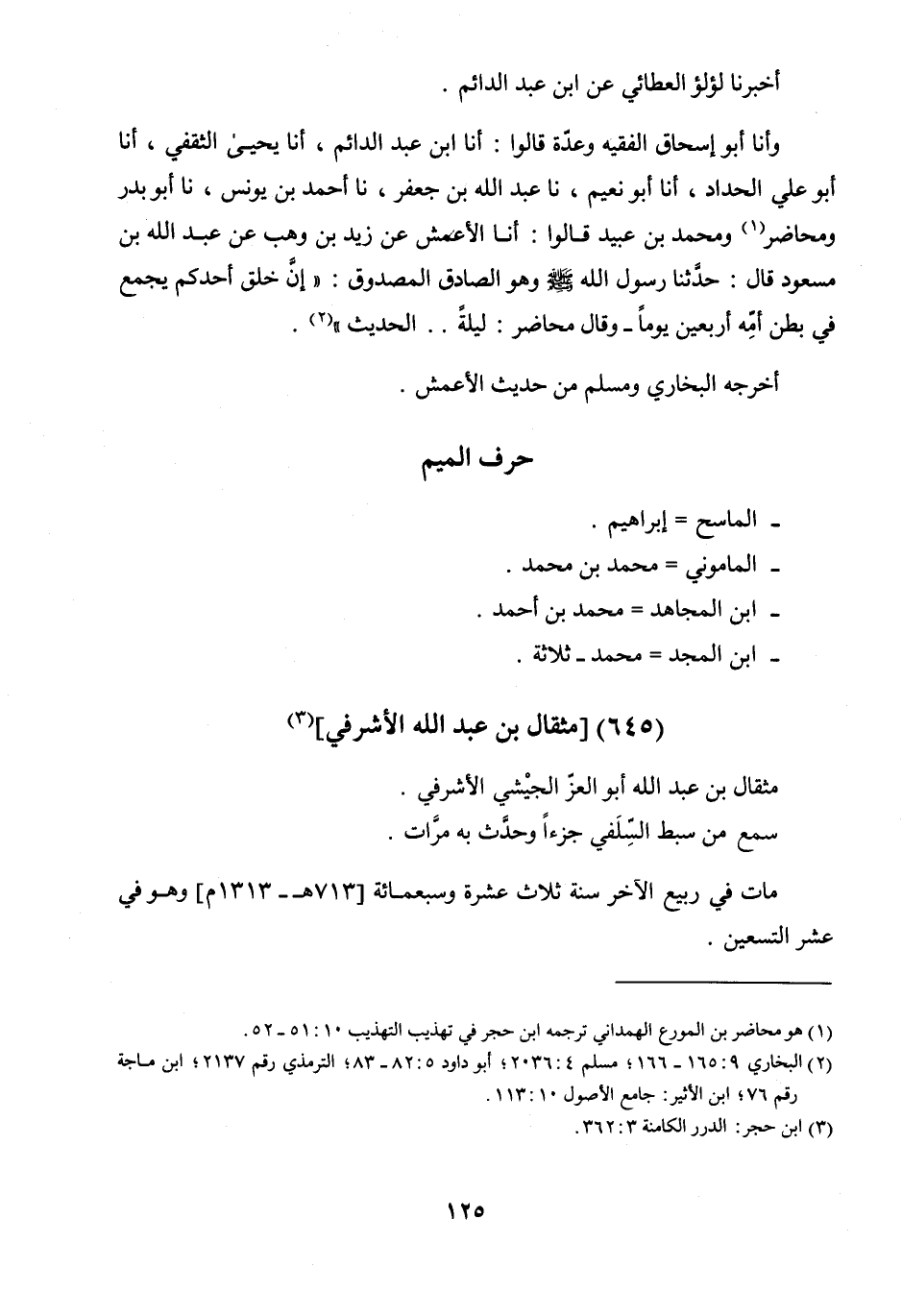 أَخْبَرَنَا لُؤْلُؤٌ الْعَطَائِيُّ، عَنِ ابْنِ عَبْدِ الدَّائِمِ، وَأَخْبَرَنَا أَبُو إِسْحَاقَ الْفَقِيهُ، وَعِدَّةٌ قَالُوا: أنا ابْنُ عَبْدِ الدَّائِمِ، أنا يَحْيَى الثَّقَفِيُّ، أنا أَبُو عَلِيٍّ الْحَدَّادُ، أنا أَبُو نُعَيْمٍ، نا عَبْدُ اللَّهِ بْنُ جَعْفَرٍ، نا أَحْمَدُ بْنُ يُونُسَ، نا أَبُو بَدْرٍ، وَمُحَاضِرٌ، وَمُحَمَّدُ بْنُ عُبَيْدٍ، قَالُوا: أنا الأَعْمَشُ، عَنْ زَيْدِ بْنِ وَهْبٍ، عَنْ عَبْدِ اللَّهِ بْنِ مَسْعُودٍ، قَالَ: حَدَّثَنَا رَسُولُ اللَّهِ صَلَّى اللَّهُ عَلَيْهِ وَسَلَّمَ وَهُوَ الصَّادِقُ الْمَصْدُوقُ: «إِنَّ خَلْقَ أَحَدِكُمْ يُجْمَعُ فِي بَطْنِ أُمِّهِ أَرْبَعِينَ يَوْمًا، وَقَالَ مُحَاضِرٌ، لَيْلَةً الْحَدِيثَ» .