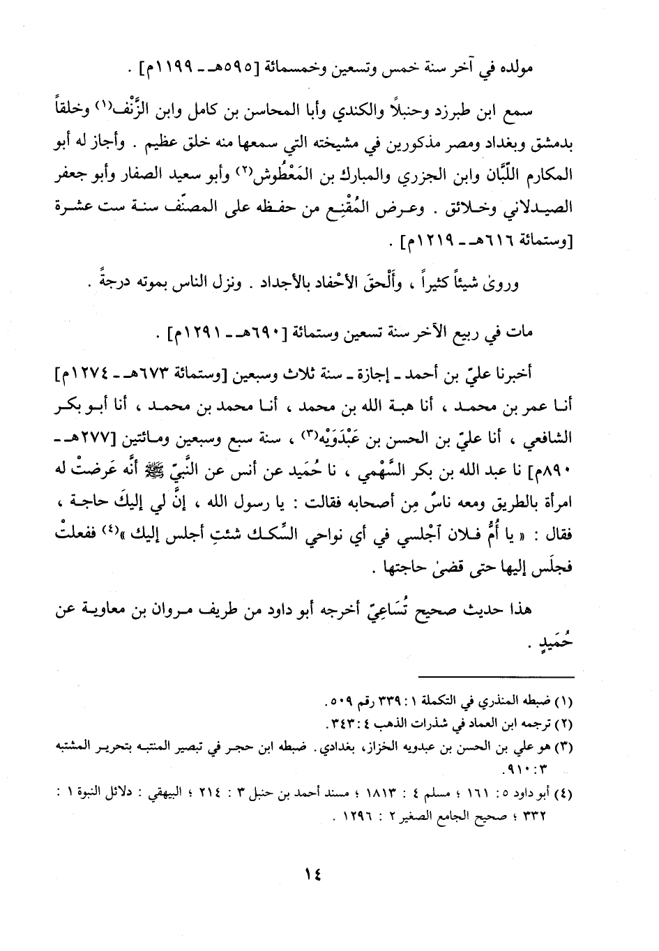 أَخْبَرَنَا عَلِيُّ بْنُ أَحْمَدَ، إِجَازَةً، سَنَةَ ثَلاثٍ وَسَبْعِينَ وَسِتِّ مِائَةٍ، أنا عُمَرُ بْنُ مُحَمَّدٍ، أنا هِبَةُ اللَّهِ بْنُ مُحَمَّدٍ، أنا مُحَمَّدُ بْنُ مُحَمَّدٍ، أنا أَبُو بَكْرٍ الشَّافِعِيُّ، أنا عَلِيُّ بْنُ الْحَسَنِ بْنِ عَبْدَوَيْهِ، سَنَةَ سَبْعٍ وَسَبْعِينَ وَمِائَتَيْنِ، نا عَبْدُ اللَّهِ بْنُ بَكْرٍ السَّهْمِيُّ، نا حُمَيْدٌ، عَنْ أَنَسٍ، عَنِ النَّبِيِّ صَلَّى اللَّهُ عَلَيْهِ وَسَلَّمَ , أَنَّهُ عَرَضَتْ لَهُ امْرَأَةٌ بِالطَّرِيقِ، وَمَعَهُ نَاسٌ مِنْ أَصْحَابِهِ، فَقَالَتْ: يَا رَسُولَ اللَّهِ، إِنَّ لِي إِلَيْكَ حَاجَةً، فَقَالَ: «يَا أُمَّ فُلانٍ اجْلِسِي فِي أَيِّ نَوَاحِي السِّكَكِ شِئْتِ أَجْلِسُ إِلَيْكِ» .