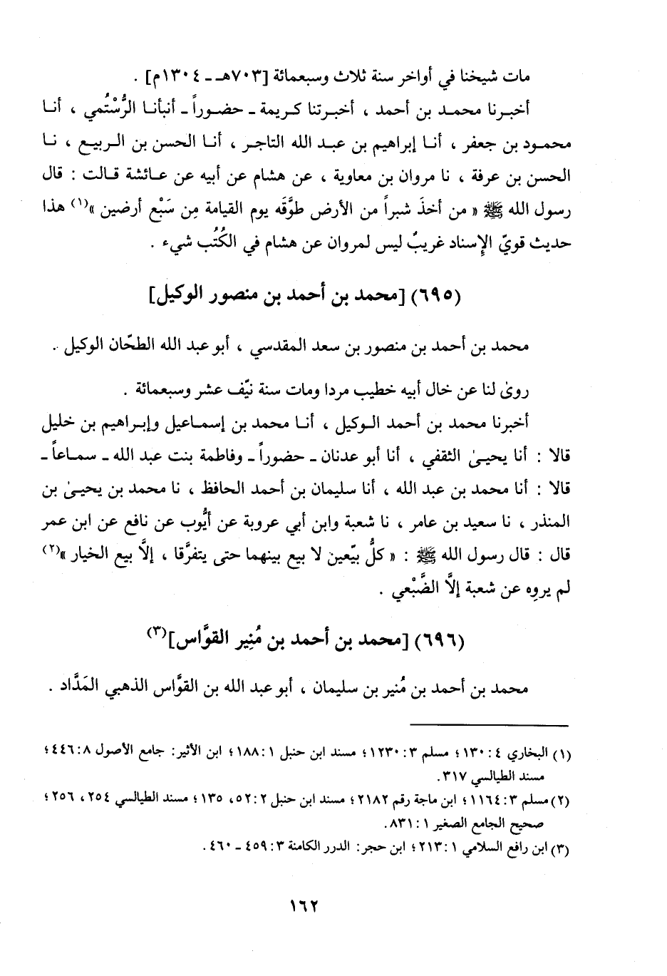 أَخْبَرَنَا مُحَمَّدُ بْنُ أَحْمَدَ، أَخْبَرَتْنَا كَرِيمَةُ، حُضُورًا، أَنْبَأَنَا الرُّسْتُمِيُّ، أنا مَحْمُودُ بْنُ جَعْفَرٍ، أنا إِبْرَاهِيمُ بْنُ عَبْدِ اللَّهِ التَّاجِرُ، أنا الْحَسَنُ بْنُ الرَّبِيعِ، نا الْحَسَنُ بْنُ عَرَفَةَ، نا مَرْوَانُ بْنُ مُعَاوِيَةَ، عَنْ هِشَامٍ، عَنْ أَبِيهِ، عَنْ عَائِشَةَ، قَالَتْ: قَالَ رَسُولُ اللَّهِ صَلَّى اللَّهُ عَلَيْهِ وَسَلَّمَ: «مَنْ أَخَذَ شِبْرًا مِنَ الأَرْضِ طَوَّقَهُ يَوْمَ الْقِيَامَةِ مِنْ سَبْعِ أَرْضِينَ» .