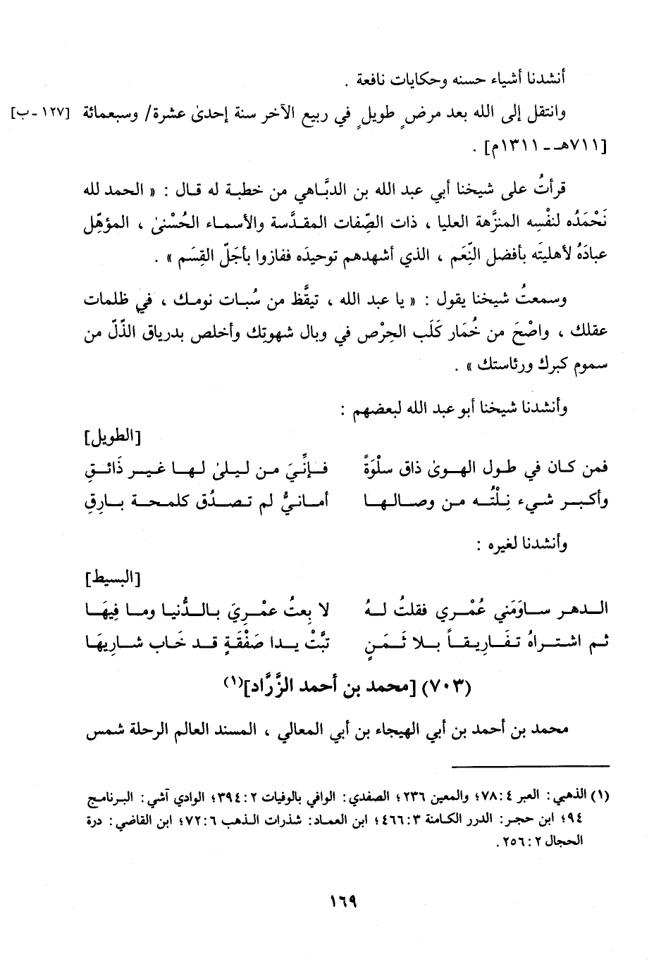 قَرَأْتُ عَلَى شَيْخِنَا أَبِي عَبْدِ اللَّهِ بْنِ الدّبَاهِيِّ مِنْ خُطْبَةٍ لَهُ قَالَ: الْحَمْدُ للَّهِ نَحْمَدُهُ لِنَفْسِهِ الْمُنَزَّهَةِ الْعُلْيَا، ذَاتِ الصِّفَاتِ الْمُقَدَّسَةِ، وَالأَسْمَاءِ الْحُسْنَى، الْمُؤَهِّلِ عِبَادَهُ لأَهْلِيَّتِهِ بِأَفْضَلِ النِّعَمِ، الَّذِي أَشْهَدَهُمْ تَوْحِيدَهُ، فَفَازُوا بِأَجَلِّ الْقِسَمِ.