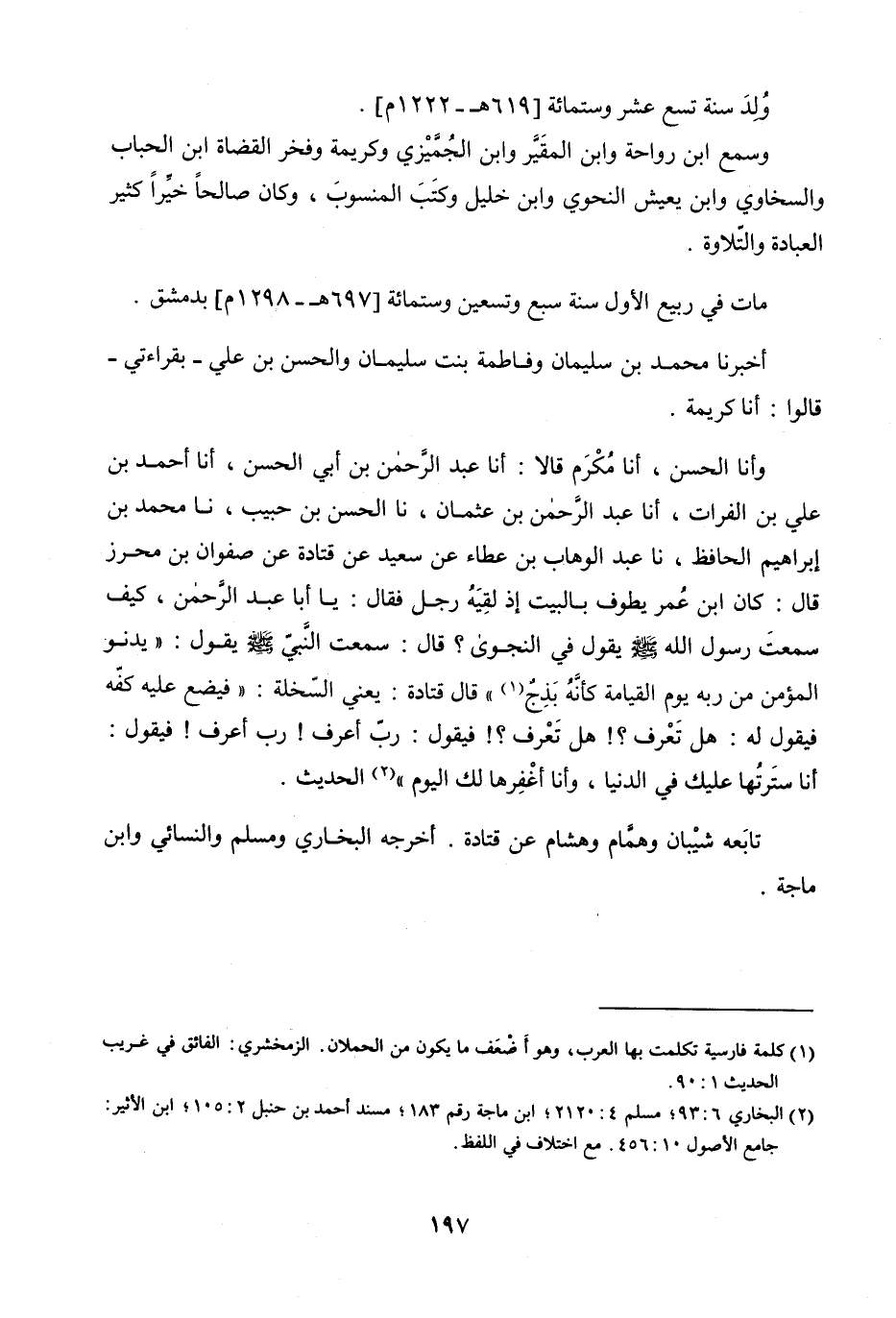 وَأنا الْحَسَنُ، أنا مُكْرَمٌ، قَالا: أنا عَبْدُ الرَّحْمَنِ بْنُ أَبِي الْحَسَنِ، أنا أَحْمَدُ بْنُ عَلِيِّ بْنِ الْفُرَاتِ، أنا عَبْدُ الرَّحْمَنِ بْنُ عُثْمَانَ، نا الْحَسَنُ بْنُ حَبِيبٍ، نا مُحَمَّدُ بْنُ إِبْرَاهِيمَ الْحَافِظُ، نا عَبْدُ الْوَهَّابِ بْنُ عَطَاءٍ، عَنْ سَعِيدٍ، عَنْ قَتَادَةَ، عَنْ صَفْوَانَ بْنِ مُحْرِزٍ، قَالَ: كَانَ ابْنُ عُمَرَ يَطُوفُ بِالْبَيْتِ إِذْ لَقِيَهُ رَجُلٌ، فَقَالَ: يَا أَبَا عَبْدِ الرَّحْمَنِ، كَيْفَ سَمِعْتَ رَسُولَ اللَّهِ صَلَّى اللَّهُ عَلَيْهِ وَسَلَّمَ يَقُولُ فِي النَّجْوَى؟ قَالَ: سَمِعْتُ رَسُولَ اللَّهِ صَلَّى اللَّهُ عَلَيْهِ وَسَلَّمَ يَقُولُ: «يَدْنُو الْمُؤْمِنُ مِنْ رَبِّهِ يَوْمَ الْقِيَامَةِ كَأَنَّهُ بَذَجٌ» ، قَالَ قَتَادَةُ: يَعْنِي السَّخْلَةَ: " فَيَضَعُ عَلَيْهِ كَفَّهُ، فَيَقُولُ لَهُ: هَلْ تَعْرِفُ؟ هَلْ تَعْرِفُ؟ فَيَقُولُ: رَبِّ أَعْرِفُ! رَبِّ أَعْرِفُ! فَيَقُولُ: أَنَا سَتَرْتُهَا عَلَيْكَ فِي الدُّنْيَا، وَأَنَا أَغْفِرُهَا لَكَ الْيَوْمَ ".