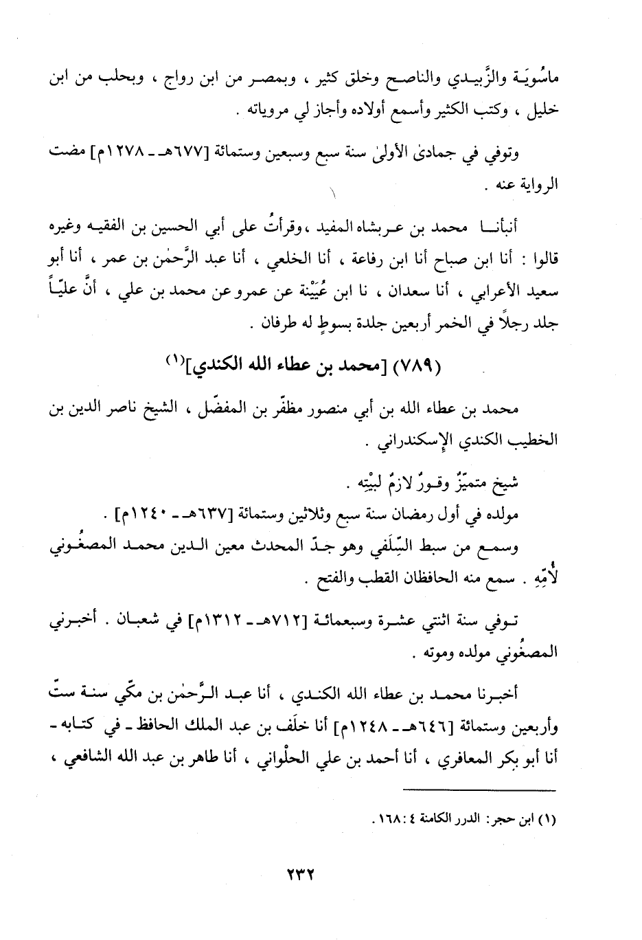 أَخْبَرَنَا مُحَمَّدُ بْنُ عَطَاءِ اللَّهِ الْكِنْدِيُّ، أنا عَبْدُ الرَّحْمَنِ بْنُ مَكِّيٍّ، سَنَةَ سِتٍّ وَأَرْبَعِينَ وَسِتِّ مِائَةٍ، أنا خَلَفُ بْنُ عَبْدِ الْمَلِكِ الْحَافِظُ، فِي كِتَابِهِ، أنا أَبُو بَكْرٍ الْمَعَافِرِيُّ، أنا أَحْمَدُ بْنُ عَلِيٍّ الْحُلْوَانِيُّ، أنا طَاهِرُ بْنُ عَبْدِ اللَّهِ الشَّافِعِيُّ،
