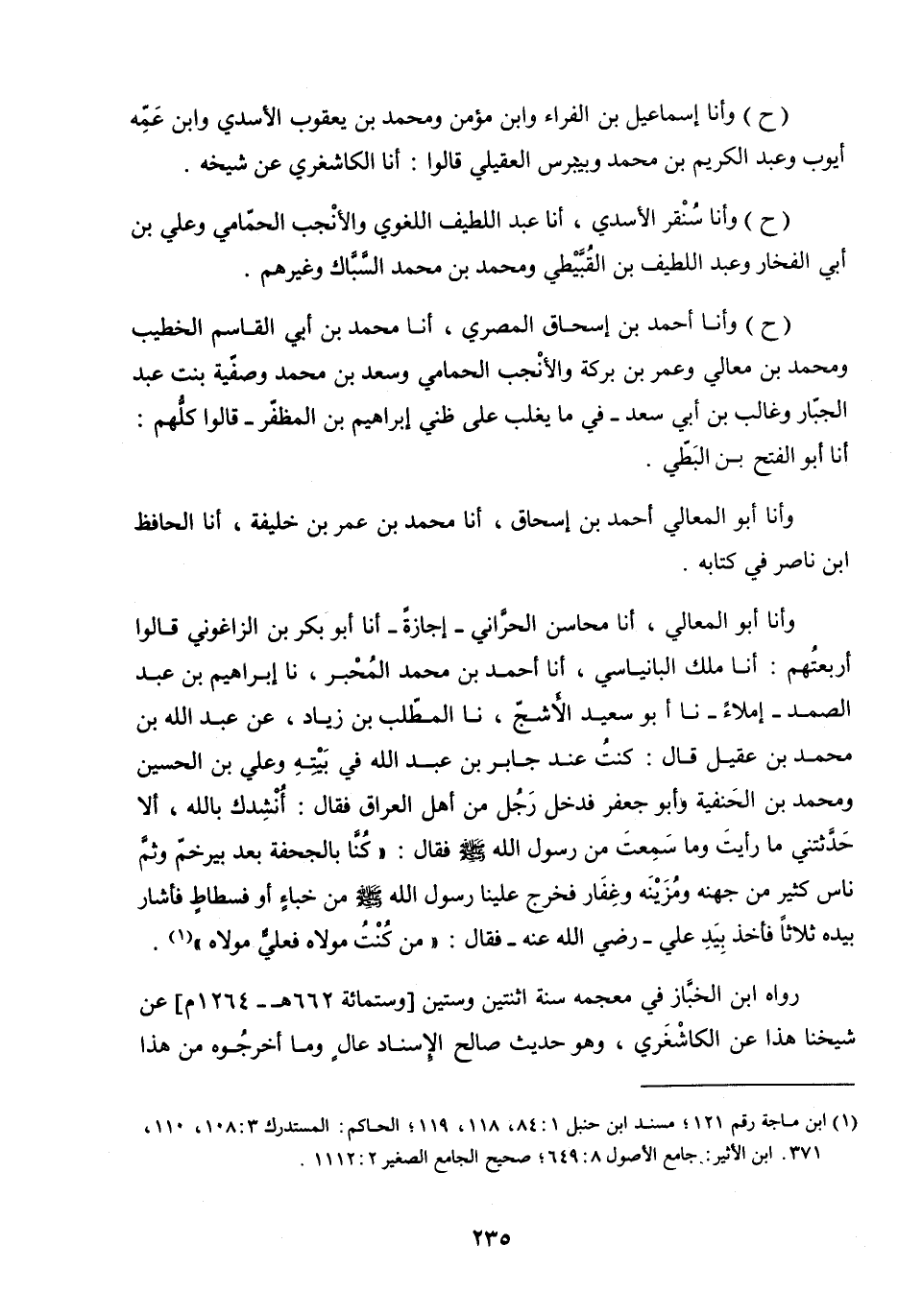 وَأَخْبَرَنَا أَبُو الْمَعَالِي، أنا مَحَاسِنُ الْحَرَّانِيُّ، إِجَازَةً، أنا أَبُو بَكْرِ بْنُ الزَّاغُونِيُّ، قَالُوا أَرْبَعَتُهُمْ: أنا مَالِكٌ الْبَانِيَاسِيُّ، أنا أَحْمَدُ بْنُ مُحَمَّدٍ الْمُحَبَّرُ، نا إِبْرَاهِيمُ بْنُ عَبْدِ الصَّمَدِ، إِمْلاءً، نا أَبُو سَعِيدٍ الأَشَجُّ، نا الْمُطَّلِبُ بْنُ زِيَادٍ، عَنْ عَبْدِ اللَّهِ بْنِ مُحَمَّدِ بْنِ عَقِيلٍ، قَالَ: كُنْتُ عِنْدَ جَابِرِ بْنِ عَبْدِ اللَّهِ فِي بَيْتِهِ، وَعَلِيِّ بْنِ الْحُسَيْنِ، وَمُحَمَّدِ ابْنِ الْحَنَفِيَّةِ، وَأَبُو جَعْفَرٍ، فَدَخَلَ رَجُلٌ مِنْ أَهْلِ الْعِرَاقِ، فَقَالَ: أُنْشِدُكَ بِاللَّهِ، أَلا حَدَّثْتَنِي مَا رَأَيْتَ، وَمَا سَمِعْتَ مِنْ رَسُولِ اللَّهِ صَلَّى اللَّهُ عَلَيْهِ وَسَلَّمَ فَقَالَ: كُنَّا بِالْجُحْفَةِ بَعْدَ بِيرِ خَمَّ وَثَمَّ نَاسٌ كَثِيرٌ مِنْ جُهَيْنَةَ وَمُزَيْنَةَ وَغِفَارٍ، فَخَرَجَ عَلَيْنَا رَسُولُ اللَّهِ صَلَّى اللَّهُ عَلَيْهِ وَسَلَّمَ مِنْ خِبَاءٍ أَوْ فُسْطَاطٍ، فَأَشَارَ بِيَدِهِ ثَلاثًا، فَأَخَذَ بِيَدِ عَلِيٍّ رَضِيَ اللَّهُ عَنْهُ، فَقَالَ: «مَنْ كُنْتُ مَوْلاهُ فَعَلِيٌّ مَوْلاهُ» .
