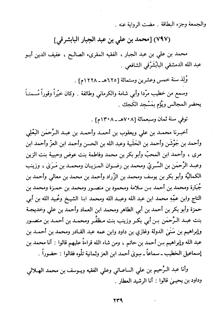 مُحَمَّدُ بْنُ عَلِيِّ بْنِ عَبْدِ الْجَبَّارِ الْفَقِيهُ الْمُقْرِئُ الصَّالِحُ عَفِيفُ الدِّينِ أَبُو عَبْدِ اللَّهِ الدِّمَشْقِيُّ الْبَابْشَرْقِيُّ الشَّافِعِيُّ