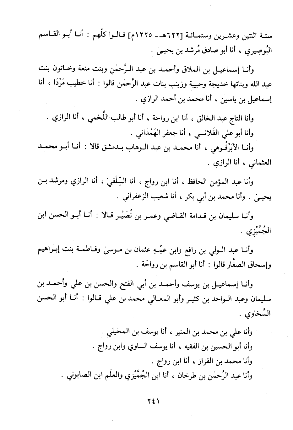 سَنَةَ اثْنَتَيْنِ وَعِشْرِينَ وَسِتِّ مِائَةٍ، قَالُوا كُلُّهُمْ: أنا أَبُو الْقَاسِمِ الْبُوصِيرِيُّ، أنا أَبُو صَادِقٍ مُرْشِدُ بْنُ يَحْيَى.