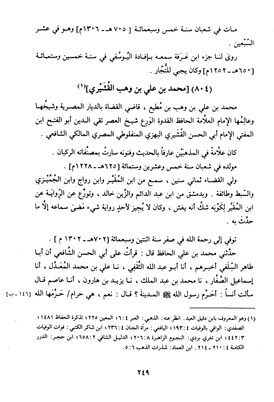 مُحَمَّدُ بْنُ عَلِيِّ بْنِ وَهْبِ بْنِ مُطِيعٍ قَاضِي الْقُضَاةِ بِالدِّيَارِ الْمِصْرِيَّةُ وَشَيْخُهَا وَعَالِمُها الإِمَامُ الْعَلامَةُ الْحَافِظُ الْقُدْوَةُ الْوَرِعُ شَيْخُ الْعَصْرِ تَقِيُّ الدِّينِ أَبُو الْفَتْحِ ابْنُ الْمُفْتِي الإِمَامِ أَبِي الْحَسَنِ الْقُشَيْرِيُّ الْبَهْزِيُّ الْمَنْفَلُوطِيُّ الْمِصْرِيُّ الْمَالِكِيُّ الشَّافِعِيُّ