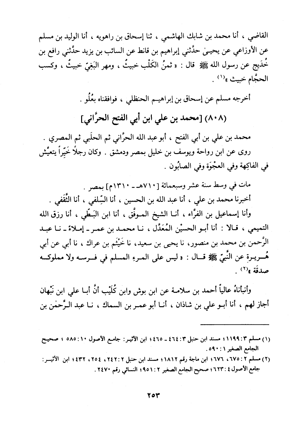 الْقَاضِي، أنا مُحَمَّدُ بْنُ شَابِكٍ الْهَاشِمِيُّ، ثنا إِسْحَاقُ بْنُ رَاهَوَيْهِ، أنا الْوَلِيدُ بْنُ مُسَلَّمٍ، عَنِ الأَوْزَاعِيِّ، عَنْ يَحْيَى، حَدَّثَنِي إِبْرَاهِيمُ بْنُ قَانِطٍ، عَنِ السَّائِبِ بْنِ يَزِيدَ، حَدَّثَنِي رَافِعُ بْنُ خَدِيجٍ، عَنْ رَسُولِ اللَّهِ صَلَّى اللَّهُ عَلَيْهِ وَسَلَّمَ قَالَ: «ثَمَنُ الْكَلْبِ خَبِيثٌ، مَهْرُ الْبَغِيِّ خَبِيثٌ، وَكَسْبُ الْحَجَّامِ خَبِيثٌ» .